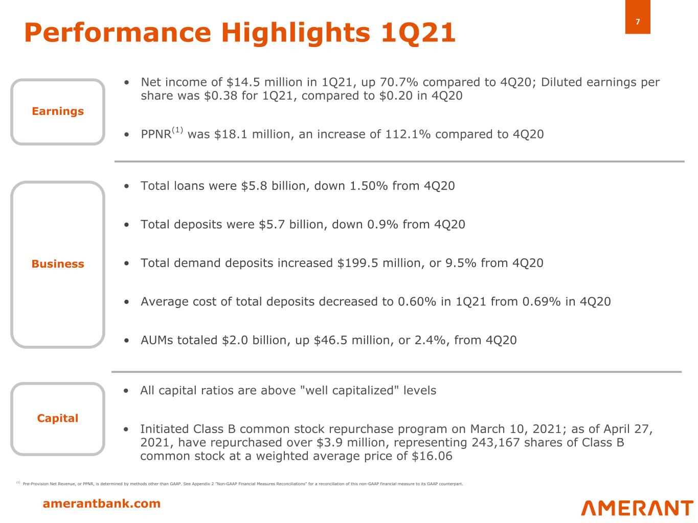 6 amerantbank.com 11.4% 3.8% 9.0% Miami Houston U.S. 5.4% 7.6% 2.9% Miami Houston U.S. T e x a s 12.9% 22.2% 7.2% Miami Houston U.S. June 30, 2020 Growing and Diverse Markets (1) The Company closed one banking center in Florida, and another in Texas, on October 30, 2020 (2) Deposit Market Share data and number of branches is as of June 30, 2020. For the current number of branches see Branch Footprint (3) Includes brokered deposits of $588 million as of June 30, 2020 (4) Includes the Katy, TX branch. The city of Katy is in Harris, Fort Bend, and Waller Counties and the new facility serves nearby areas of these counties (5) Our Sugar Land, TX branch also serves Fort Bend County and our Katy, TX branch lies adjacent to this market (6) Community banks include those with less than $10 billion in assets Sources: Deposit data from FDIC as of June 30, 2020 (Bank-level). Market demographics, and county data and market share from S&P Global. Market Intelligence as of June 30, 2020 Amerant is growing in attractive markets and is the largest community bank in the Miami-Dade MSA (6) Deposit Market Share (2) Market Demographics Market Branches Deposits ($mm) % of AMTB Market Share % Miami-Dade, FL (3) 10 $4,992 81.4 3.1 Broward, FL 6 361 5.9 0.6 Palm Beach, FL 3 124 1.7 0.2 Florida 19 $5,477 89.0 % 1.9 % Market Branches Deposits ($mm) % of AMTB Market Share % Harris, TX (4)(5) 7 $577 9.5 0.2 Montgomery, TX 1 77 1.5 0.5 Texas 8 $654 11.0 % 0.2% Branch Footprint (1) F lo ri d a 2010 – 2021 Est. Population Change 2021 – 2026 Median Est. Household Income Change 2021 – 2026 Est. Population Change 7 banking centers 18 banking centers March 31, 2021