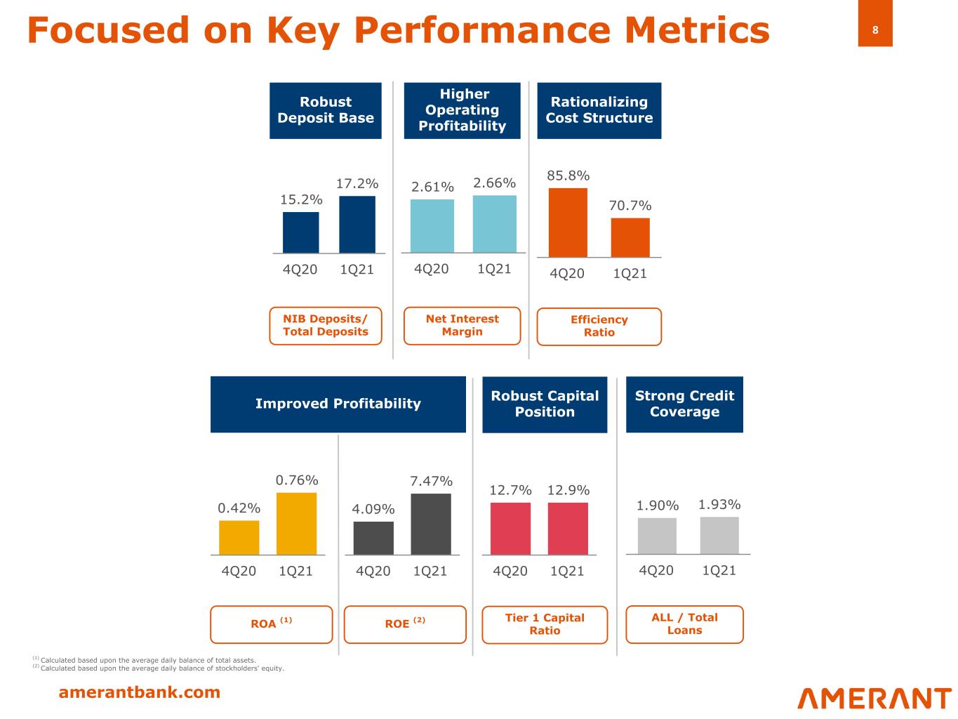 7 amerantbank.com • All capital ratios are above "well capitalized" levels • Initiated Class B common stock repurchase program on March 10, 2021; as of April 27, 2021, have repurchased over $3.9 million, representing 243,167 shares of Class B common stock at a weighted average price of $16.06 Performance Highlights 1Q21 Capital Business • Net income of $14.5 million in 1Q21, up 70.7% compared to 4Q20; Diluted earnings per share was $0.38 for 1Q21, compared to $0.20 in 4Q20 • PPNR(1) was $18.1 million, an increase of 112.1% compared to 4Q20 • Total loans were $5.8 billion, down 1.50% from 4Q20 • Total deposits were $5.7 billion, down 0.9% from 4Q20 • Total demand deposits increased $199.5 million, or 9.5% from 4Q20 • Average cost of total deposits decreased to 0.60% in 1Q21 from 0.69% in 4Q20 • AUMs totaled $2.0 billion, up $46.5 million, or 2.4%, from 4Q20 Earnings (1) Pre-Provision Net Revenue, or PPNR, is determined by methods other than GAAP. See Appendix 2 ”Non-GAAP Financial Measures Reconciliations" for a reconciliation of this non-GAAP financial measure to its GAAP counterpart.