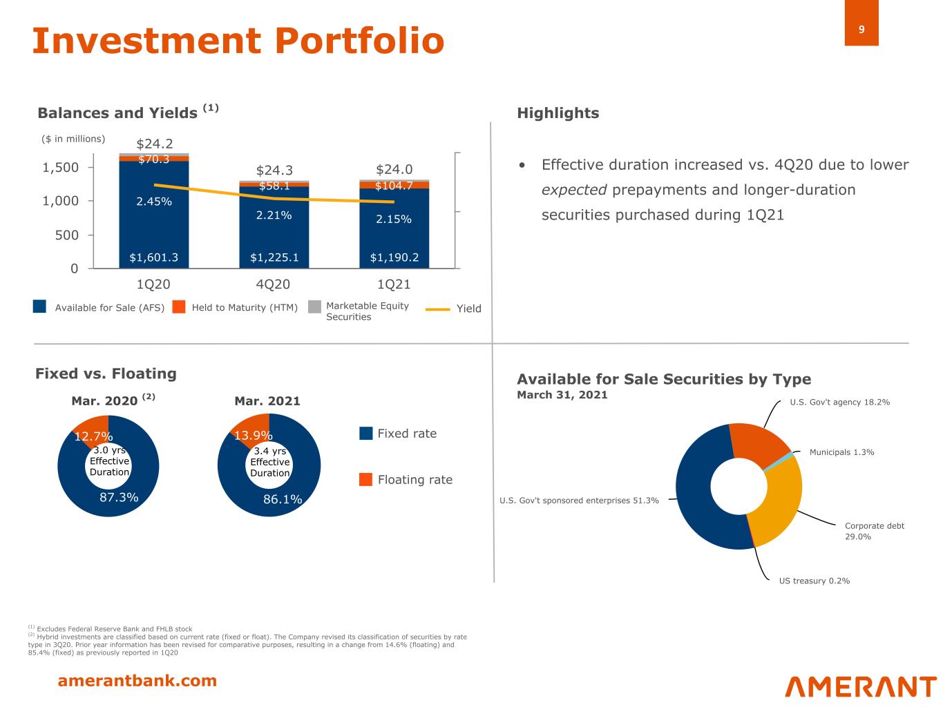 8 amerantbank.com 85.8% 70.7% 4Q20 1Q21 15.2% 17.2% 4Q20 1Q21 12.7% 12.9% 4Q20 1Q21 2.61% 2.66% 4Q20 1Q21 Focused on Key Performance Metrics Robust Deposit Base Robust Capital Position Higher Operating Profitability Rationalizing Cost Structure (1) Calculated based upon the average daily balance of total assets. (2) Calculated based upon the average daily balance of stockholders' equity. 1.90% 1.93% 4Q20 1Q21 Strong Credit Coverage 0.42% 0.76% 4Q20 1Q21 Improved Profitability 4.09% 7.47% 4Q20 1Q21 NIB Deposits/ Total Deposits Tier 1 Capital Ratio Net Interest Margin Efficiency Ratio ALL / Total LoansROA (1) ROE (2)