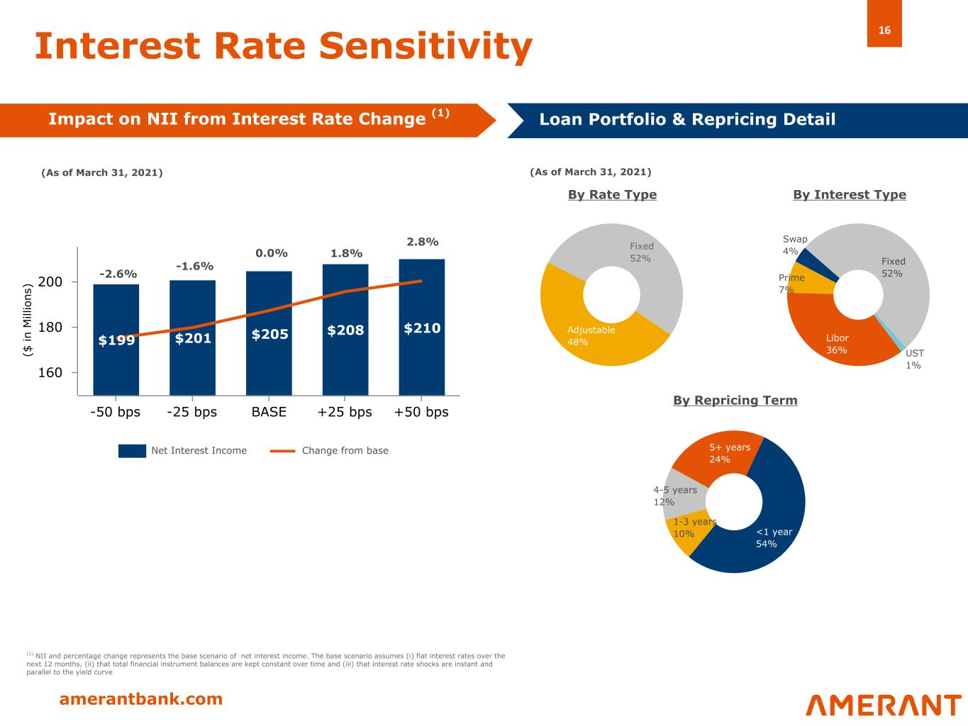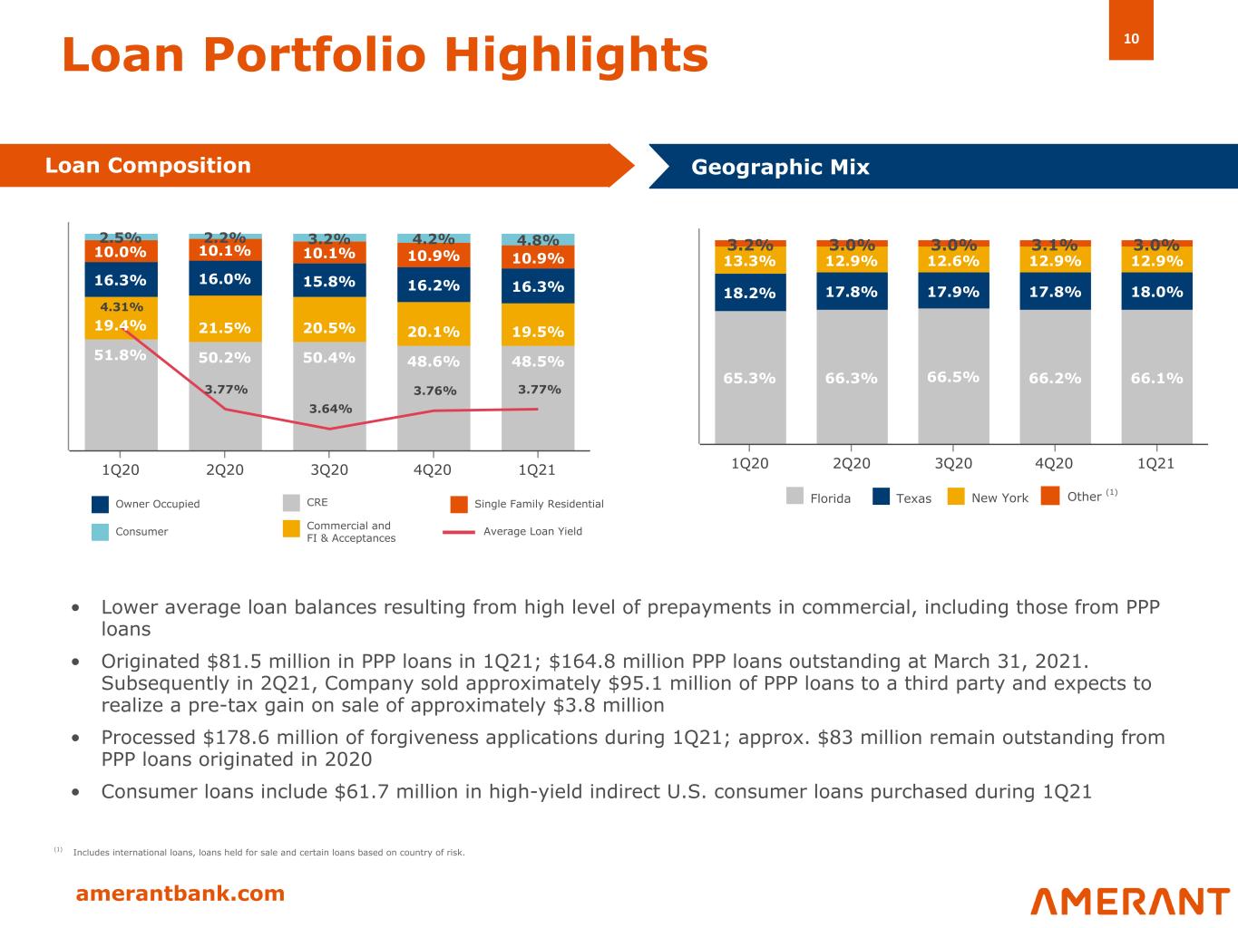 9 amerantbank.com 86.1% 13.9% U.S. Gov't sponsored enterprises 51.3% U.S. Gov't agency 18.2% Municipals 1.3% Corporate debt 29.0% US treasury 0.2% $1,601.3 $1,225.1 $1,190.2 $70.3 $58.1 $104.7 $24.2 $24.3 $24.0 2.45% 2.21% 2.15% 1Q20 4Q20 1Q21 0 500 1,000 1,500 87.3% 12.7% • Effective duration increased vs. 4Q20 due to lower expected prepayments and longer-duration securities purchased during 1Q21 Investment Portfolio Balances and Yields (1) Available for Sale (AFS) Held to Maturity (HTM) Highlights Fixed vs. Floating Mar. 2020 (2) Mar. 2021 Floating rate Fixed rate Available for Sale Securities by Type March 31, 2021 3.0 yrs Effective Duration ($ in millions) Marketable Equity Securities (1) Excludes Federal Reserve Bank and FHLB stock (2) Hybrid investments are classified based on current rate (fixed or float). The Company revised its classification of securities by rate type in 3Q20. Prior year information has been revised for comparative purposes, resulting in a change from 14.6% (floating) and 85.4% (fixed) as previously reported in 1Q20 Yield 3.4 yrs Effective Duration
