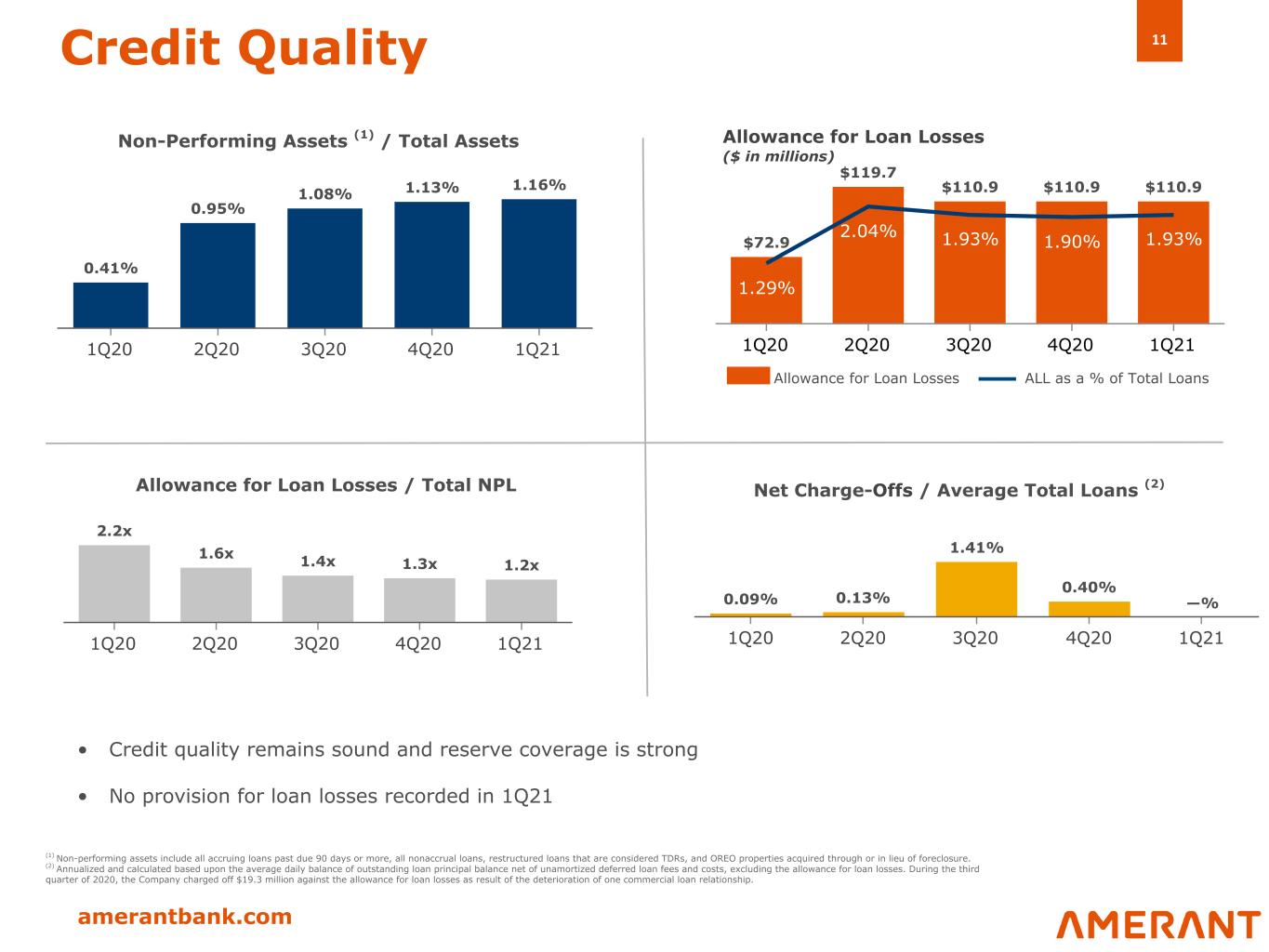 10 amerantbank.com 51.8% 50.2% 50.4% 48.6% 48.5% 19.4% 21.5% 20.5% 20.1% 19.5% 16.3% 16.0% 15.8% 16.2% 16.3% 10.0% 10.1% 10.1% 10.9% 10.9% 2.5% 2.2% 3.2% 4.2% 4.8% 4.31% 3.77% 3.64% 3.76% 3.77% 1Q20 2Q20 3Q20 4Q20 1Q21 65.3% 66.3% 66.5% 66.2% 66.1% 18.2% 17.8% 17.9% 17.8% 18.0% 13.3% 12.9% 12.6% 12.9% 12.9% 3.2% 3.0% 3.0% 3.1% 3.0% 1Q20 2Q20 3Q20 4Q20 1Q21 Consumer CRE Commercial and FI & Acceptances Owner Occupied Single Family Residential Loan Portfolio Highlights Loan Composition Geographic Mix (Domestic) • Lower average loan balances resulting from high level of prepayments in commercial, including those from PPP loans • Originated $81.5 million in PPP loans in 1Q21; $164.8 million PPP loans outstanding at March 31, 2021. Subsequently in 2Q21, Company sold approximately $95.1 million of PPP loans to a third party and expects to realize a pre-tax gain on sale of approximately $3.8 million • Processed $178.6 million of forgiveness applications during 1Q21; approx. $83 million remain outstanding from PPP loans originated in 2020 • Consumer loans include $61.7 million in high-yield indirect U.S. consumer loans purchased during 1Q21 Florida Texas New York Average Loan Yield Other (1) (1) Includes international loans, loans held for sale and certain loans based on country of risk.