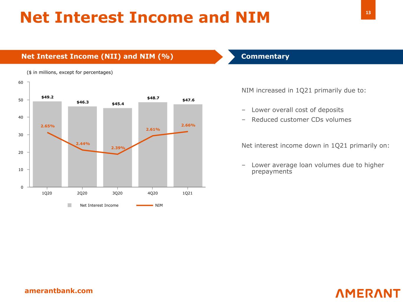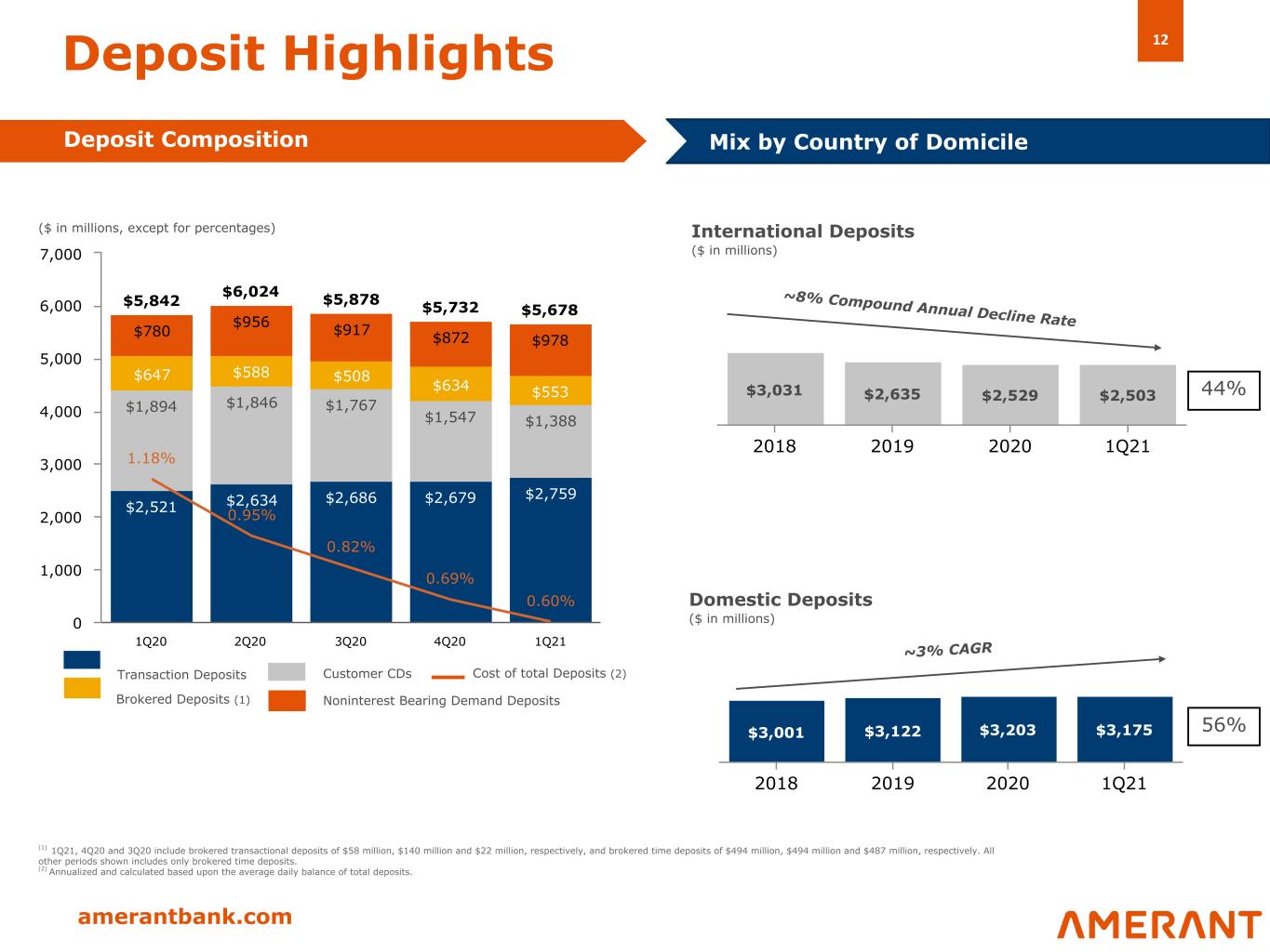 12 amerantbank.com $5,842 $6,024 $5,878 $5,732 $5,678 $2,521 $2,634 $2,686 $2,679 $2,759 $1,894 $1,846 $1,767 $1,547 $1,388 $647 $588 $508 $634 $553 $780 $956 $917 $872 $978 1.18% 0.95% 0.82% 0.69% 0.60% 1Q20 2Q20 3Q20 4Q20 1Q21 0 1,000 2,000 3,000 4,000 5,000 6,000 7,000 $3,031 $2,635 $2,529 $2,503 2018 2019 2020 1Q21 $3,001 $3,122 $3,203 $3,175 2018 2019 2020 1Q21 ~3% CAGR Domestic Deposits ($ in millions) ~8% Compound Annual Decline Rate Deposit Highlights Deposit Composition 56% International Deposits ($ in millions) Mix by Country of Domicile Transaction Deposits Customer CDs Brokered Deposits (1) Cost of total Deposits (2) ($ in millions, except for percentages) 44% (1) 1Q21, 4Q20 and 3Q20 include brokered transactional deposits of $58 million, $140 million and $22 million, respectively, and brokered time deposits of $494 million, $494 million and $487 million, respectively. All other periods shown includes only brokered time deposits. (2) Annualized and calculated based upon the average daily balance of total deposits. Noninterest Bearing Demand Deposits