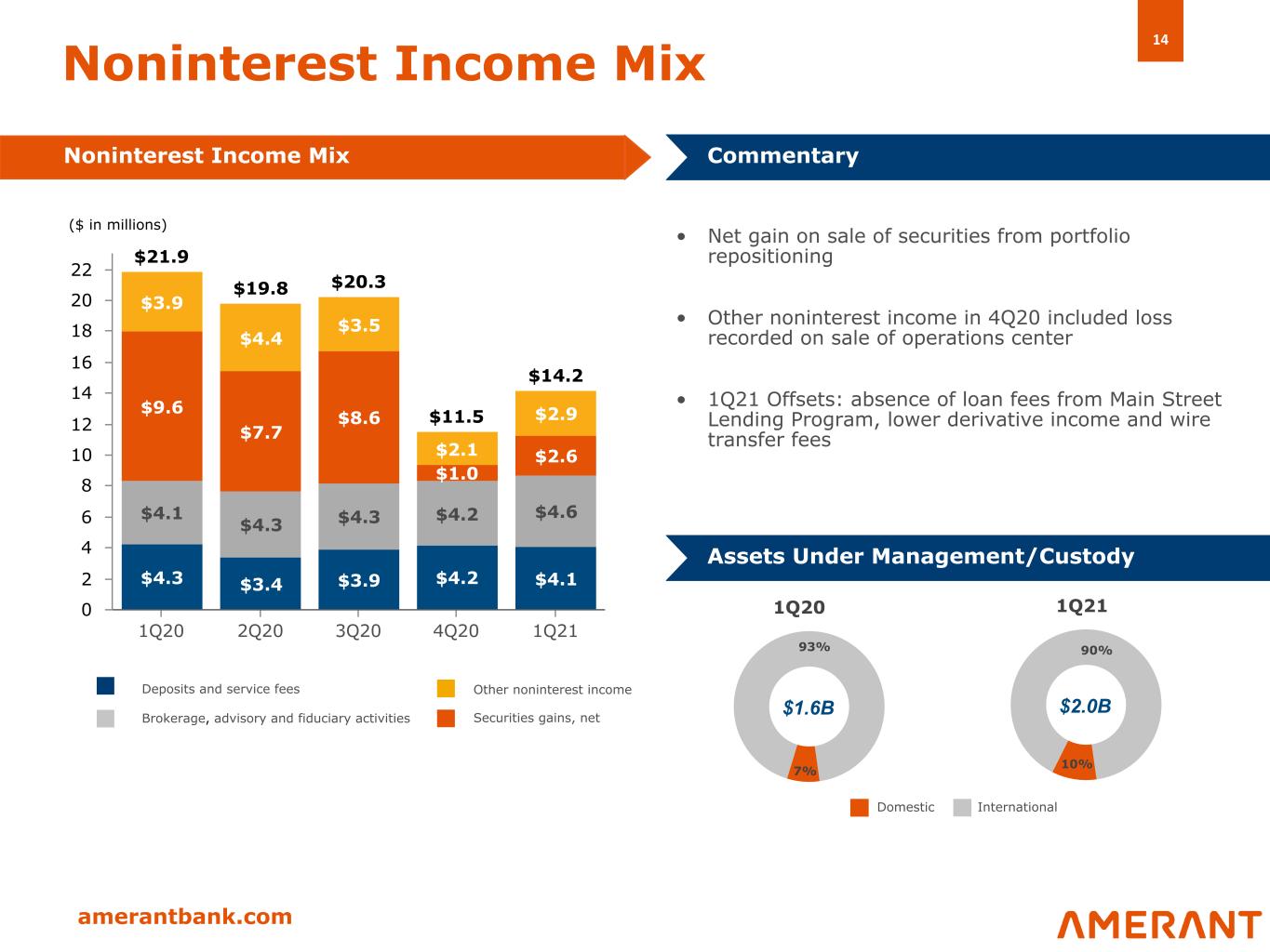 13 amerantbank.com $49.2 $46.3 $45.4 $48.7 $47.6 2.65% 2.44% 2.39% 2.61% 2.66% Net Interest Income NIM 1Q20 2Q20 3Q20 4Q20 1Q21 0 10 20 30 40 50 60 NIM increased in 1Q21 primarily due to: – Lower overall cost of deposits – Reduced customer CDs volumes Net interest income down in 1Q21 primarily on: – Lower average loan volumes due to higher prepayments Net Interest Income and NIM Net Interest Income (NII) and NIM (%) Commentary ($ in millions, except for percentages)