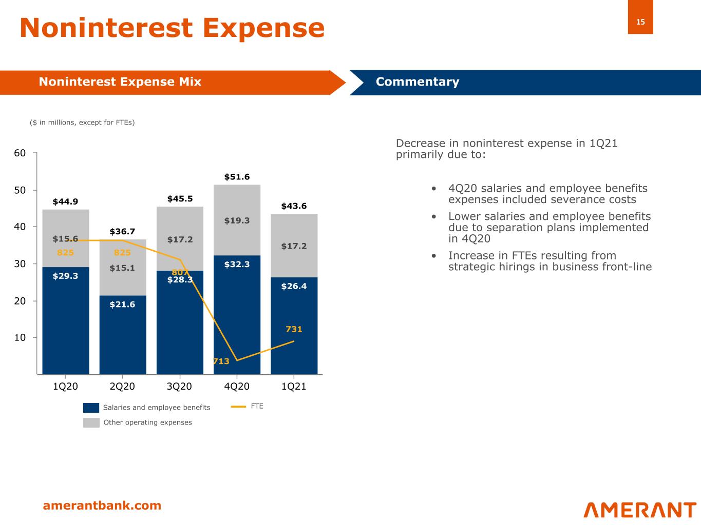 14 amerantbank.com $21.9 $19.8 $20.3 $11.5 $14.2 $4.3 $3.4 $3.9 $4.2 $4.1 $4.1 $4.3 $4.3 $4.2 $4.6 $9.6 $7.7 $8.6 $1.0 $2.6 $3.9 $4.4 $3.5 $2.1 $2.9 1Q20 2Q20 3Q20 4Q20 1Q21 0 2 4 6 8 10 12 14 16 18 20 22 7% 93% 10% 90% Noninterest Income Mix Noninterest Income Mix Commentary • Net gain on sale of securities from portfolio repositioning • Other noninterest income in 4Q20 included loss recorded on sale of operations center • 1Q21 Offsets: absence of loan fees from Main Street Lending Program, lower derivative income and wire transfer fees Assets Under Management/Custody Deposits and service fees Brokerage, advisory and fiduciary activities Other noninterest income $2.0B Domestic International 1Q211Q20 $1.6B ($ in millions) Securities gains, net