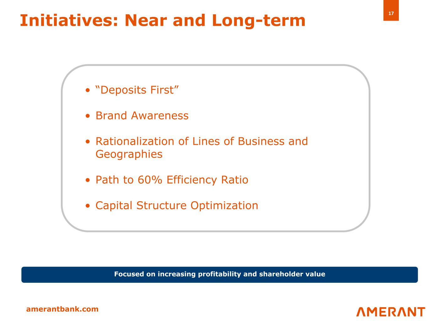 17 amerantbank.com Initiatives: Near and Long-term • “Deposits First” • Brand Awareness • Rationalization of Lines of Business and Geographies • Path to 60% Efficiency Ratio • Capital Structure Optimization Focused on increasing profitability and shareholder value