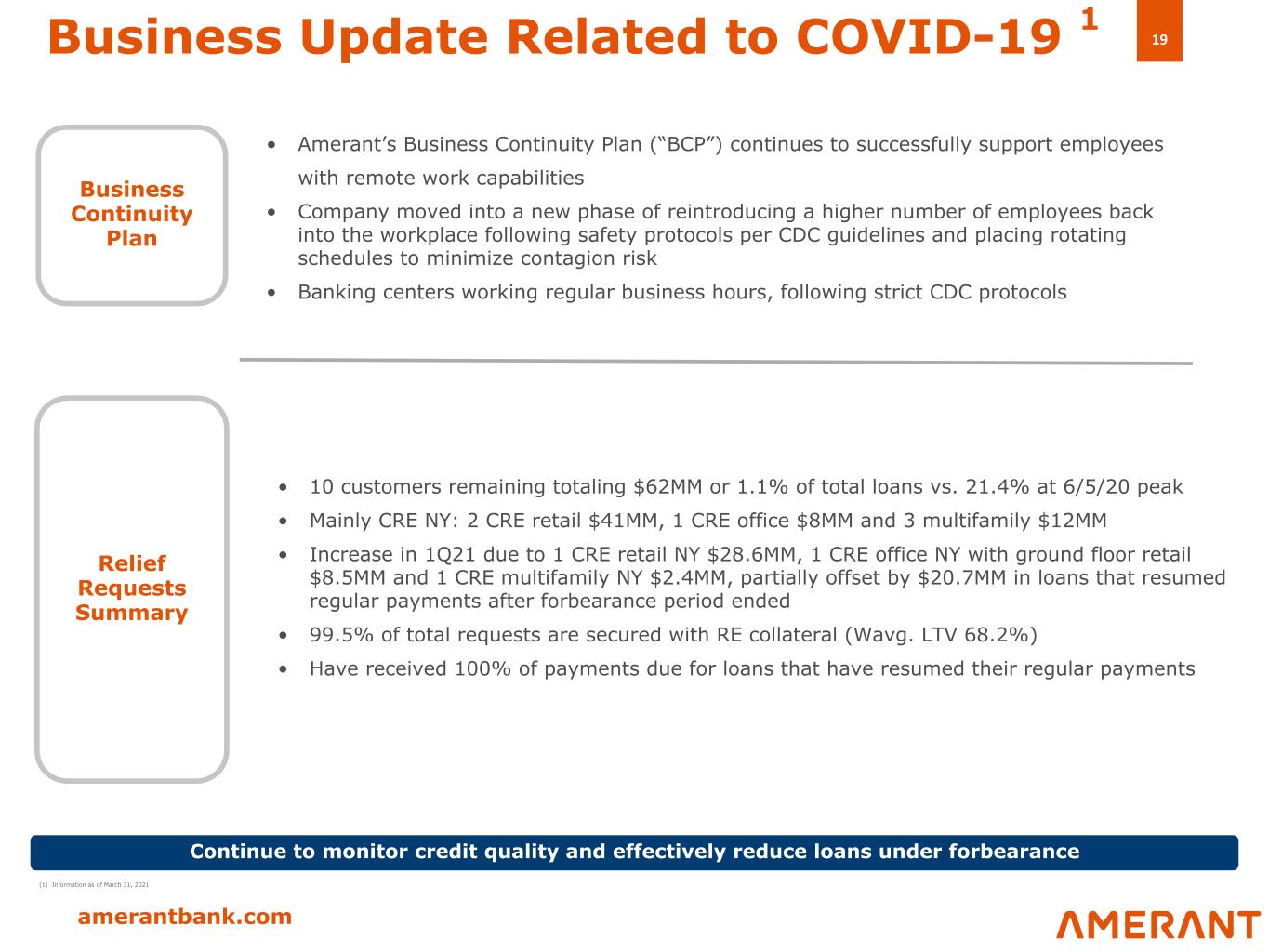 19 amerantbank.com Business Update Related to COVID-19 1 • Amerant’s Business Continuity Plan (“BCP”) continues to successfully support employees with remote work capabilities • Company moved into a new phase of reintroducing a higher number of employees back into the workplace following safety protocols per CDC guidelines and placing rotating schedules to minimize contagion risk • Banking centers working regular business hours, following strict CDC protocols Business Continuity Plan Relief Requests Summary Continue to monitor credit quality and effectively reduce loans under forbearance • 10 customers remaining totaling $62MM or 1.1% of total loans vs. 21.4% at 6/5/20 peak • Mainly CRE NY: 2 CRE retail $41MM, 1 CRE office $8MM and 3 multifamily $12MM • Increase in 1Q21 due to 1 CRE retail NY $28.6MM, 1 CRE office NY with ground floor retail $8.5MM and 1 CRE multifamily NY $2.4MM, partially offset by $20.7MM in loans that resumed regular payments after forbearance period ended • 99.5% of total requests are secured with RE collateral (Wavg. LTV 68.2%) • Have received 100% of payments due for loans that have resumed their regular payments (1) Information as of March 31, 2021