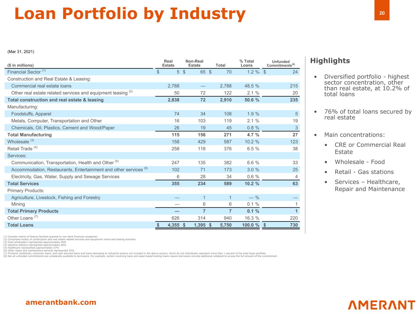 20 amerantbank.com Loan Portfolio by Industry • Diversified portfolio - highest sector concentration, other than real estate, at 10.2% of total loans • 76% of total loans secured by real estate • Main concentrations: • CRE or Commercial Real Estate • Wholesale - Food • Retail - Gas stations • Services – Healthcare, Repair and Maintenance Highlights (1) Consists mainly of finance facilities granted to non-bank financial companies. (2) Comprised mostly of construction and real estate related services and equipment rental and leasing activities (3) Food wholesalers represented approximately 40% (4) Gasoline stations represented approximately 60% (5) Healthcare represented approximately 57% (6) Other repair and maintenance services represented 53% (7) Primarily residential, consumer loans, and cash secured loans and loans belonging to industrial sectors not included in the above sectors, which do not individually represent more than 1 percent of the total loans portfolio (8) Not all unfunded commitments are unilaterally available to borrowers. For example, certain revolving loans and asset based lending loans require borrowers provide additional collateral to access the full amount of the commitment ($ in millions) Real Estate Non-Real Estate Total % Total Loans Unfunded Commitments(8) Financial Sector (1) $ 5 $ 65 $ 70 1.2 % 2 4 $ 24 Construction and Real Estate & Leasing: Commercial real estate loans 2,788 — 2,788 48.5 % 215 Other real estate related services and equipment leasing (2) 50 72 122 2.1 % 20 Total construction and real estate & leasing 2,838 72 2,910 50.6 % 235 Manufacturing: Foodstuffs, Apparel 74 34 108 1.9 % 5 Metals, Computer, Transportation and Other 16 103 119 2.1 % 19 Chemicals, Oil, Plastics, Cement and Wood/Paper 26 19 45 0.8 % 3 Total Manufacturing 115 156 271 4.7 % 27 Wholesale (3) 158 429 587 10.2 % 123 Retail Trade (4) 258 118 376 6.5 % 38 Services: Communication, Transportation, Health and Other (5) 247 135 382 6.6 % 33 Accommodation, Restaurants, Entertainment and other services (6) 102 71 173 3.0 % 25 Electricity, Gas, Water, Supply and Sewage Services 6 28 34 0.6 % 4 Total Services 355 234 589 10.2 % 63 Primary Products: Agriculture, Livestock, Fishing and Forestry — 1 1 — % — Mining — 6 6 0.1 % 1 Total Primary Products — 7 7 0.1 % 1 Other Loans (7) 626 314 940 16.3 % 220 Total Loans $ 4,355 $ 1,395 $ 5,750 100.0 % $ 730 (Mar 31, 2021)