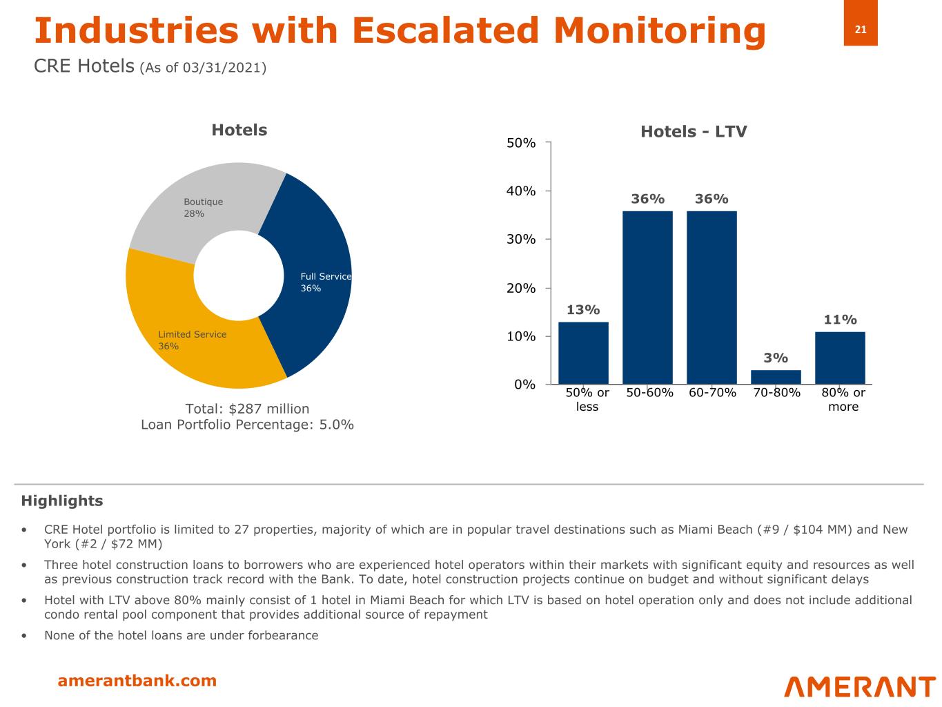 22 amerantbank.com 11% 23% 41% 19% 6% 50% or less 50- 60% 60- 70% 70- 80% 80% or more 0% 10% 20% 30% 40% 50% 60% Industries with Escalated Monitoring CRE Retail (As of 03/31/2021) • Florida and Texas are focused on neighborhood shopping centers or service centers with basic needs related anchor stores, as well as the retail corridor in Miami Beach • New York is focused on high traffic retail corridors with proximity to public transportation services • Single-tenant vacant consist of two properties located in the New York-Midtown submarket with strong sponsors carrying the property or with cash flow sweep reserves in place Highlights CRE Retail (1) Retail - LTV Food and Health Retail36% Clothing 27% Banking 8% Restaurant 3% Education 9% Groceries 4% Vacant 14% CRE Retail - Single Tenant (1) (1) CRE retail loans above $5 million Total: $1.1 billion Loan Portfolio Percentage: 18.9% Total: $190 million Loan Portfolio Percentage: 3.3% Neighborhood Center 20% Single Tenant 24% Strip/Convenience 29% Community Center15% Theme/Festival Center 12%