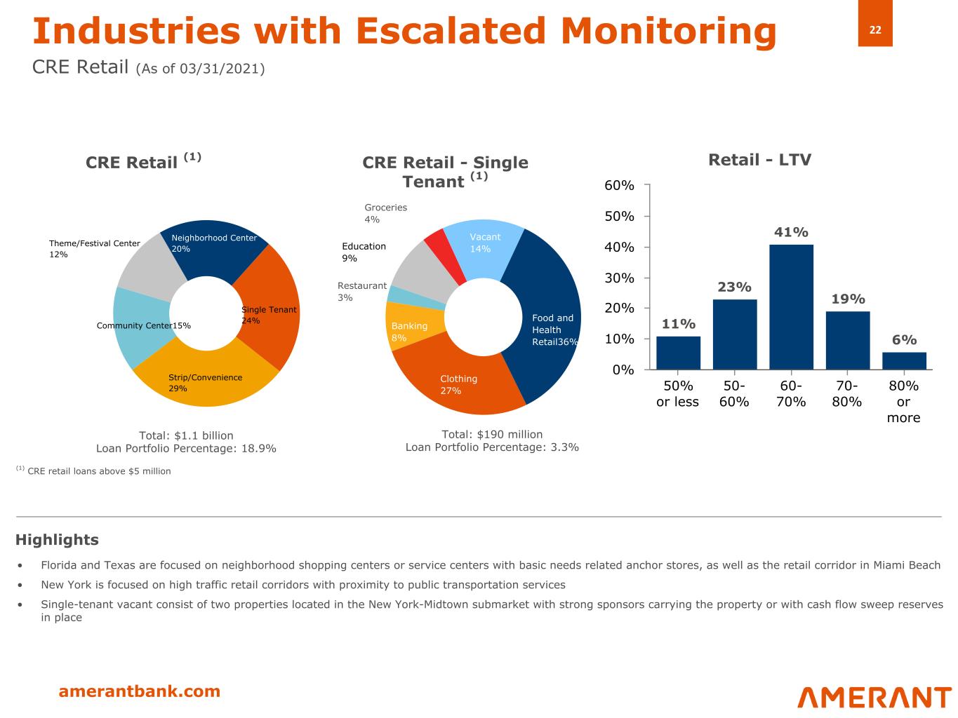 21 amerantbank.com Industries with Escalated Monitoring CRE Hotels (As of 03/31/2021) • CRE Hotel portfolio is limited to 27 properties, majority of which are in popular travel destinations such as Miami Beach (#9 / $104 MM) and New York (#2 / $72 MM) • Three hotel construction loans to borrowers who are experienced hotel operators within their markets with significant equity and resources as well as previous construction track record with the Bank. To date, hotel construction projects continue on budget and without significant delays • Hotel with LTV above 80% mainly consist of 1 hotel in Miami Beach for which LTV is based on hotel operation only and does not include additional condo rental pool component that provides additional source of repayment • None of the hotel loans are under forbearance Highlights Full Service 36% Limited Service 36% Boutique 28% Hotels 13% 36% 36% 3% 11% 0% 10% 20% 30% 40% 50% 50% or less 50-60% 60-70% 70-80% 80% or more Hotels - LTV Total: $287 million Loan Portfolio Percentage: 5.0%