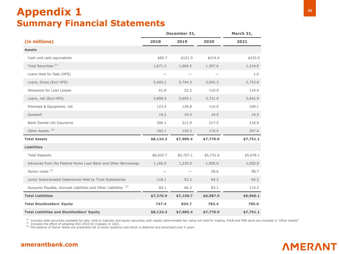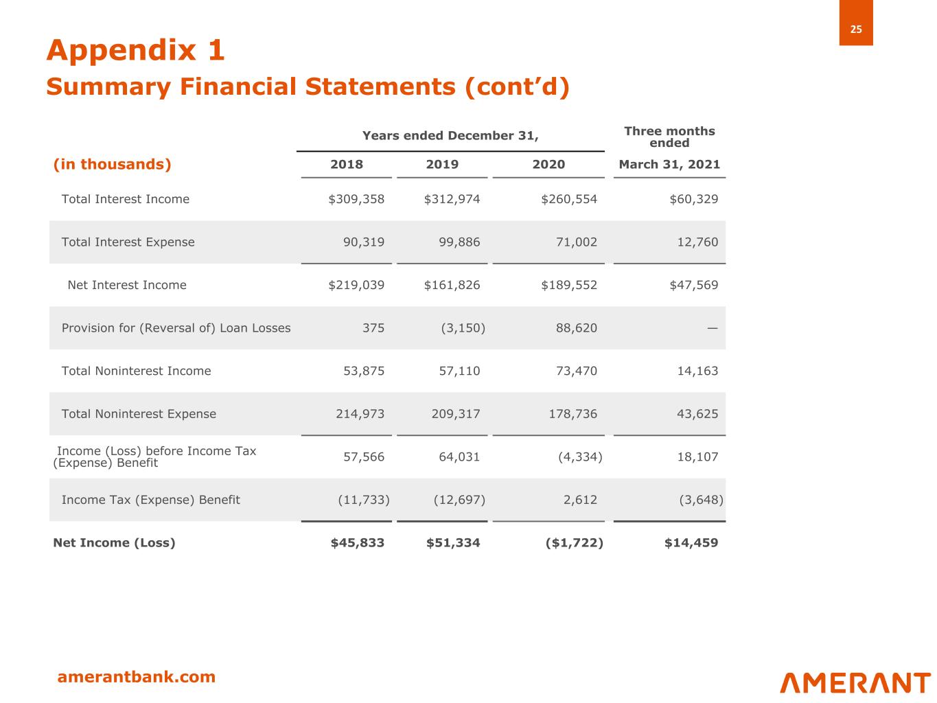 24 amerantbank.com Appendix 1 Summary Financial Statements (1) Includes debt securities available for sale, held to maturity and equity securities with readily determinable fair value not held for trading. FHLB and FRB stock are included in "Other Assets" (2) Includes the effect of adopting ASU 2016-02 (Leases) in 1Q21. (3) The balance of Senior Notes are presented net of direct issuance cost which is deferred and amortized over 5 years December 31, March 31, (in millions) 2018 2019 2020 2021 Assets Cash and cash equivalents $85.7 $121.3 $214.4 $233.5 Total Securities (1) 1,671.2 1,666.5 1,307.6 1,318.8 Loans Held for Sale (HFS) — — — 1.0 Loans, Gross (Excl HFS) 5,920.2 5,744.3 5,842.3 5,753.8 Allowance for Loan Losses 61.8 52.2 110.9 110.9 Loans, net (Excl HFS) 5,858.4 5,692.1 5,731.4 5,642.9 Premises & Equipment, net 123.5 128.8 110.0 109.1 Goodwill 19.2 19.5 19.5 19.5 Bank Owned Life Insurance 206.1 211.9 217.5 218.9 Other Assets (2) 160.1 145.3 170.5 207.4 Total Assets $8,124.3 $7,985.4 $7,770.9 $7,751.1 Liabilities Total Deposits $6,032.7 $5,757.1 $5,731.6 $5,678.1 Advances from the Federal Home Loan Bank and Other Borrowings 1,166.0 1,235.0 1,050.0 1,050.0 Senior notes (3) — — 58.6 58.7 Junior Subordinated Debentures Held by Trust Subsidiaries 118.1 92.2 64.2 64.2 Accounts Payable, Accrued Liabilities and Other Liabilities (2) 60.1 66.3 83.1 115.2 Total Liabilities $7,376.9 $7,150.7 $6,987.5 $6,966.1 Total Stockholders' Equity 747.4 834.7 783.4 785.0 Total Liabilities and Stockholders' Equity $8,124.3 $7,985.4 $7,770.9 $7,751.1