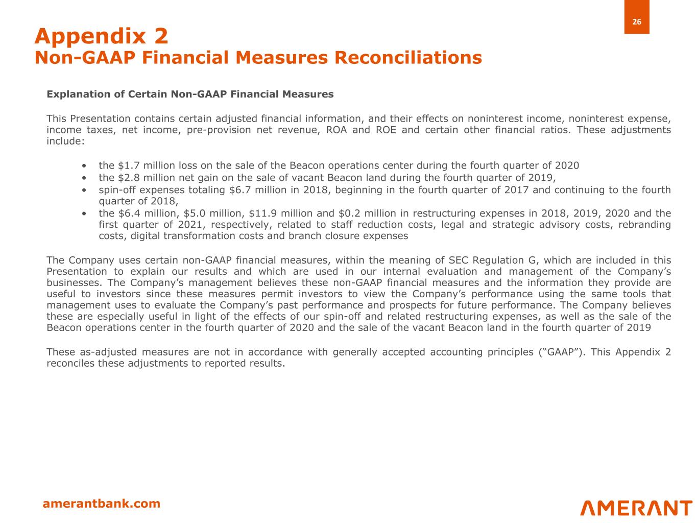 25 amerantbank.com Appendix 1 Summary Financial Statements (cont’d) Years ended December 31, Three months ended (in thousands) 2018 2019 2020 March 31, 2021 Total Interest Income $309,358 $312,974 $260,554 $60,329 Total Interest Expense 90,319 99,886 71,002 12,760 Net Interest Income $219,039 $161,826 $189,552 $47,569 Provision for (Reversal of) Loan Losses 375 (3,150) 88,620 — Total Noninterest Income 53,875 57,110 73,470 14,163 Total Noninterest Expense 214,973 209,317 178,736 43,625 Income (Loss) before Income Tax (Expense) Benefit 57,566 64,031 (4,334) 18,107 Income Tax (Expense) Benefit (11,733) (12,697) 2,612 (3,648) Net Income (Loss) $45,833 $51,334 ($1,722) $14,459