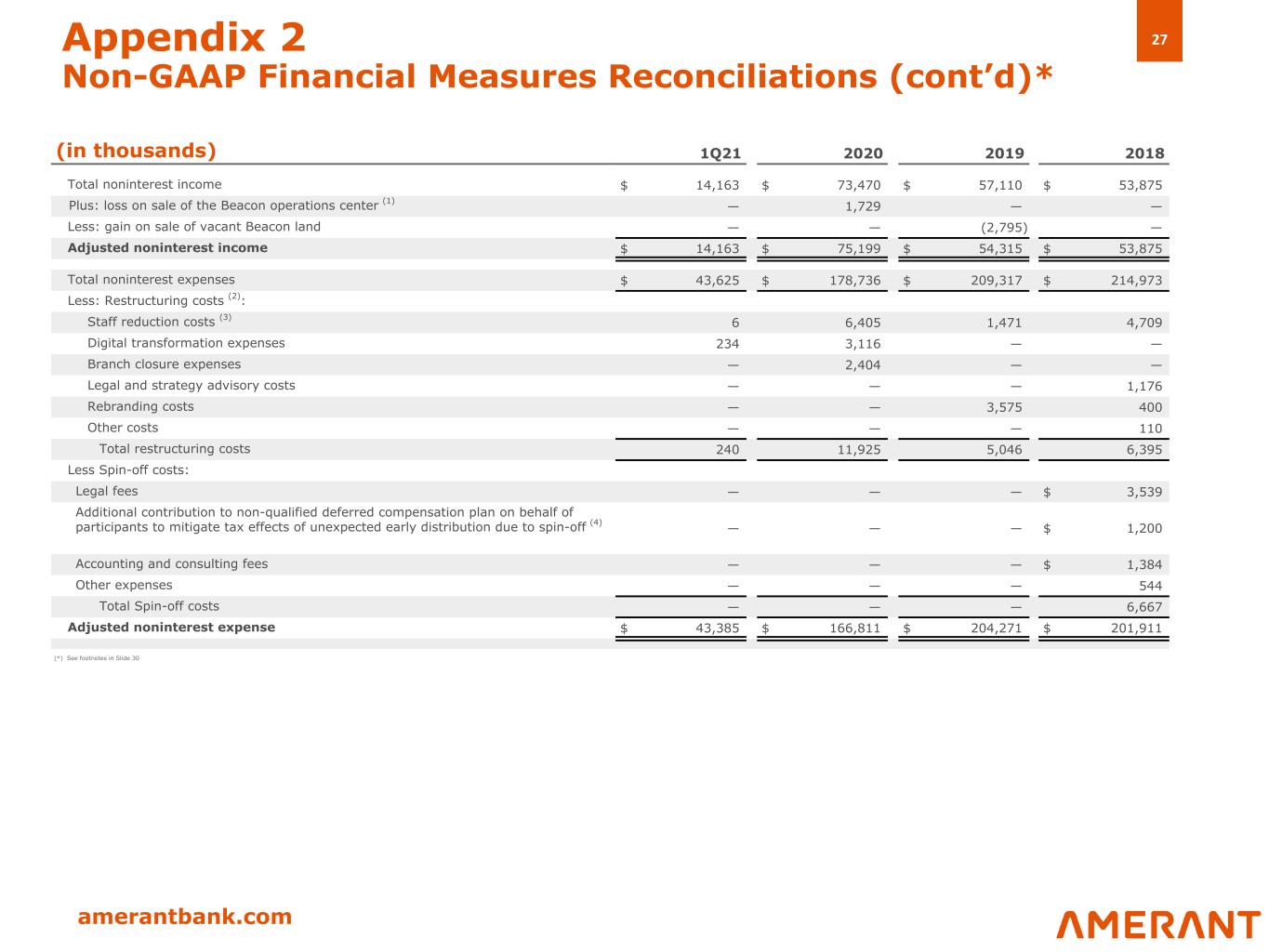 26 amerantbank.com Appendix 2 Non-GAAP Financial Measures Reconciliations Explanation of Certain Non-GAAP Financial Measures This Presentation contains certain adjusted financial information, and their effects on noninterest income, noninterest expense, income taxes, net income, pre-provision net revenue, ROA and ROE and certain other financial ratios. These adjustments include: • the $1.7 million loss on the sale of the Beacon operations center during the fourth quarter of 2020 • the $2.8 million net gain on the sale of vacant Beacon land during the fourth quarter of 2019, • spin-off expenses totaling $6.7 million in 2018, beginning in the fourth quarter of 2017 and continuing to the fourth quarter of 2018, • the $6.4 million, $5.0 million, $11.9 million and $0.2 million in restructuring expenses in 2018, 2019, 2020 and the first quarter of 2021, respectively, related to staff reduction costs, legal and strategic advisory costs, rebranding costs, digital transformation costs and branch closure expenses The Company uses certain non-GAAP financial measures, within the meaning of SEC Regulation G, which are included in this Presentation to explain our results and which are used in our internal evaluation and management of the Company’s businesses. The Company’s management believes these non-GAAP financial measures and the information they provide are useful to investors since these measures permit investors to view the Company’s performance using the same tools that management uses to evaluate the Company’s past performance and prospects for future performance. The Company believes these are especially useful in light of the effects of our spin-off and related restructuring expenses, as well as the sale of the Beacon operations center in the fourth quarter of 2020 and the sale of the vacant Beacon land in the fourth quarter of 2019 These as-adjusted measures are not in accordance with generally accepted accounting principles (“GAAP”). This Appendix 2 reconciles these adjustments to reported results.