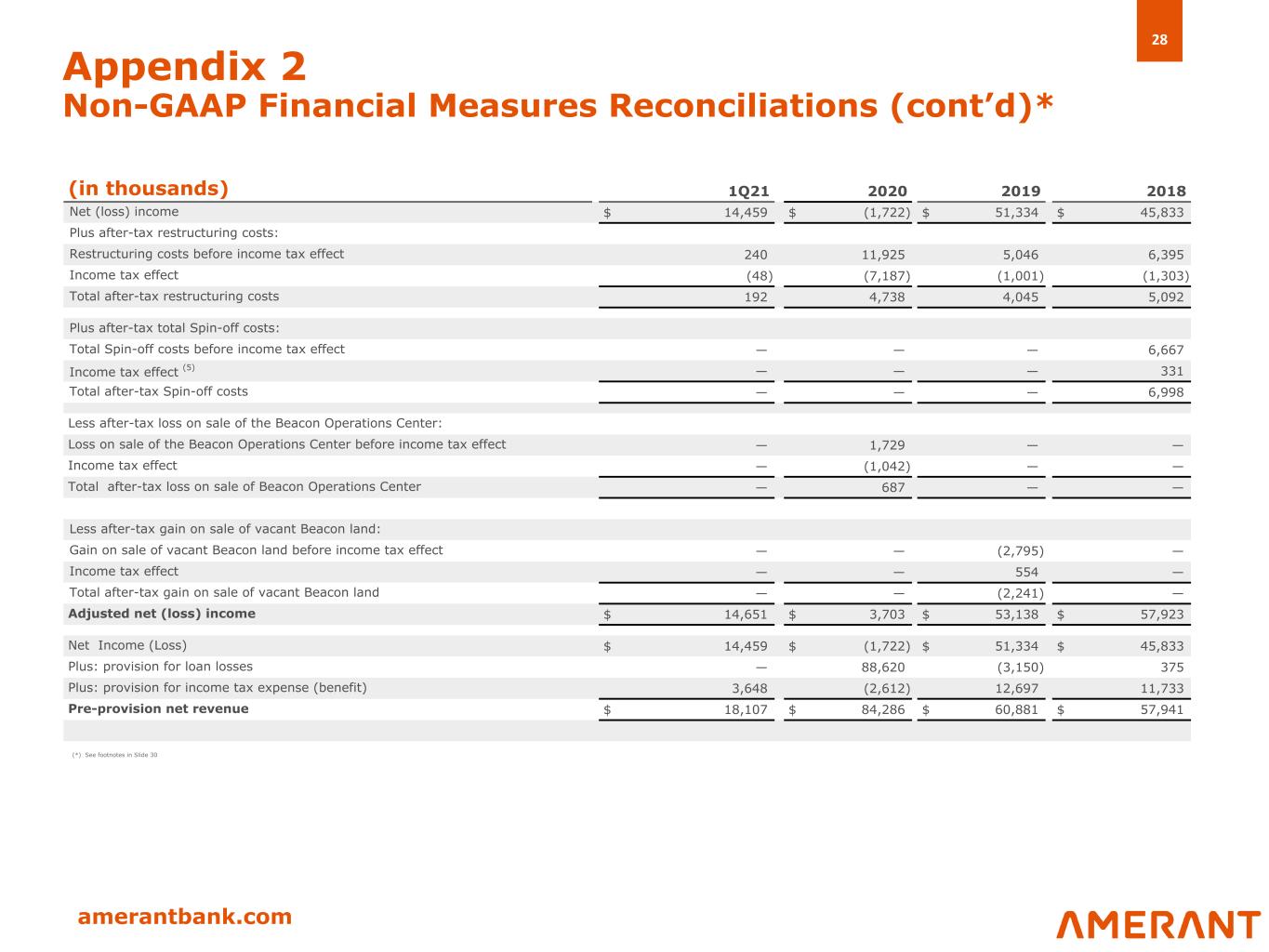 27 amerantbank.com Appendix 2 Non-GAAP Financial Measures Reconciliations (cont’d)* (in thousands) 1Q21 2020 2019 2018 Total noninterest income $ 14,163 $ 73,470 $ 57,110 $ 53,875 Plus: loss on sale of the Beacon operations center (1) — 1,729 — — Less: gain on sale of vacant Beacon land — — (2,795) — Adjusted noninterest income $ 14,163 $ 75,199 $ 54,315 $ 53,875 Total noninterest expenses $ 43,625 $ 178,736 $ 209,317 $ 214,973 Less: Restructuring costs (2): Staff reduction costs (3) 6 6,405 1,471 4,709 Digital transformation expenses 234 3,116 — — Branch closure expenses — 2,404 — — Legal and strategy advisory costs — — — 1,176 Rebranding costs — — 3,575 400 Other costs — — — 110 Total restructuring costs 240 11,925 5,046 6,395 Less Spin-off costs: Legal fees — — — $ 3,539 Additional contribution to non-qualified deferred compensation plan on behalf of participants to mitigate tax effects of unexpected early distribution due to spin-off (4) — — — $ 1,200 Accounting and consulting fees — — — $ 1,384 Other expenses — — — 544 Total Spin-off costs — — — 6,667 Adjusted noninterest expense $ 43,385 $ 166,811 $ 204,271 $ 201,911 (*) See footnotes in Slide 30