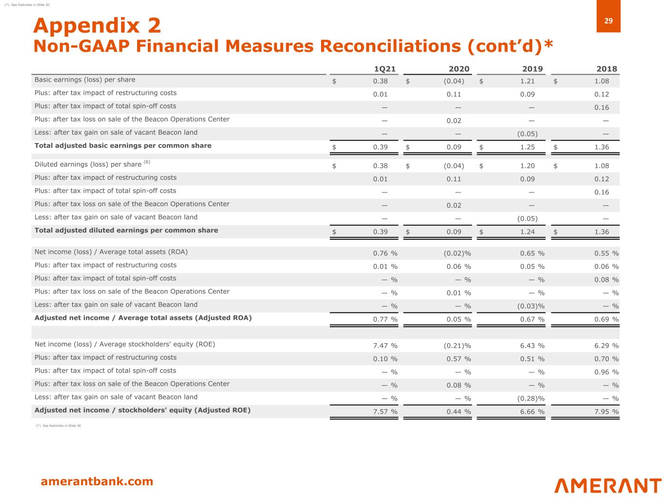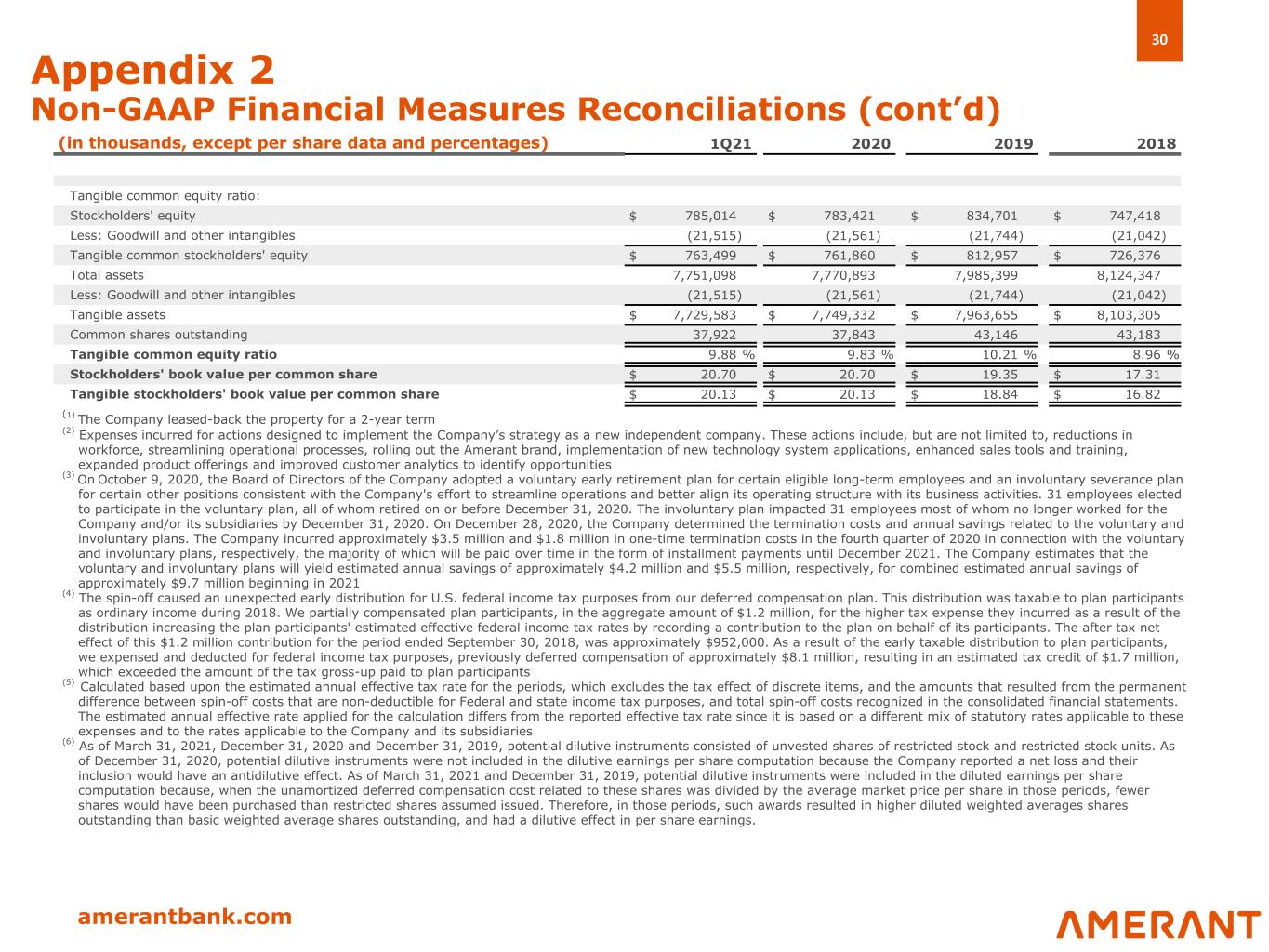 29 amerantbank.com Appendix 2 Non-GAAP Financial Measures Reconciliations (cont’d)* 1Q21 2020 2019 2018 Basic earnings (loss) per share $ 0.38 $ (0.04) $ 1.21 $ 1.08 Plus: after tax impact of restructuring costs 0.01 0.11 0.09 0.12 Plus: after tax impact of total spin-off costs — — — 0.16 Plus: after tax loss on sale of the Beacon Operations Center — 0.02 — — Less: after tax gain on sale of vacant Beacon land — — (0.05) — Total adjusted basic earnings per common share $ 0.39 $ 0.09 $ 1.25 $ 1.36 Diluted earnings (loss) per share (6) $ 0.38 $ (0.04) $ 1.20 $ 1.08 Plus: after tax impact of restructuring costs 0.01 0.11 0.09 0.12 Plus: after tax impact of total spin-off costs — — — 0.16 Plus: after tax loss on sale of the Beacon Operations Center — 0.02 — — Less: after tax gain on sale of vacant Beacon land — — (0.05) — Total adjusted diluted earnings per common share $ 0.39 $ 0.09 $ 1.24 $ 1.36 Net income (loss) / Average total assets (ROA) 0.76 % (0.02) % 0.65 % 0.55 % Plus: after tax impact of restructuring costs 0.01 % 0.06 % 0.05 % 0.06 % Plus: after tax impact of total spin-off costs — % — % — % 0.08 % Plus: after tax loss on sale of the Beacon Operations Center — % 0.01 % — % — % Less: after tax gain on sale of vacant Beacon land — % — % (0.03) % — % Adjusted net income / Average total assets (Adjusted ROA) 0.77 % 0.05 % 0.67 % 0.69 % Net income (loss) / Average stockholders' equity (ROE) 7.47 % (0.21) % 6.43 % 6.29 % Plus: after tax impact of restructuring costs 0.10 % 0.57 % 0.51 % 0.70 % Plus: after tax impact of total spin-off costs — % — % — % 0.96 % Plus: after tax loss on sale of the Beacon Operations Center — % 0.08 % — % — % Less: after tax gain on sale of vacant Beacon land — % — % (0.28) % — % Adjusted net income / stockholders' equity (Adjusted ROE) 7.57 % 0.44 % 6.66 % 7.95 % (*) See footnotes in Slide 30 (*) See footnotes in Slide 30