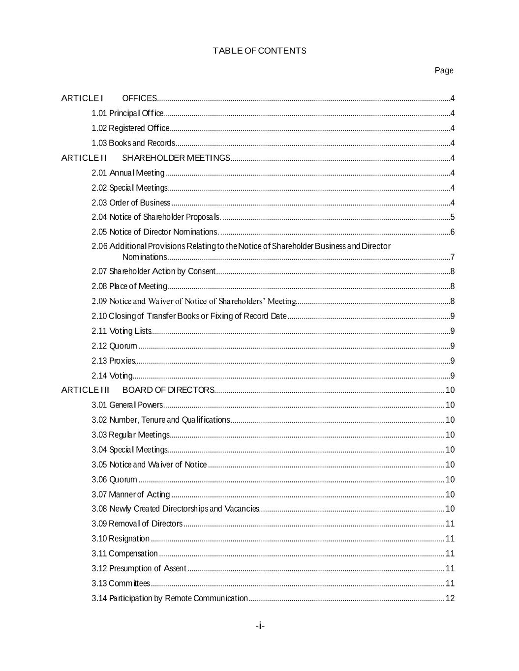 TABLE OF CONTENTS Page -i- ARTICLE I OFFICES ................................................................................................................................................4 1.01 Principal Office.............................................................................................................................................4 1.02 Registered Office..........................................................................................................................................4 1.03 Books and Records .......................................................................................................................................4 ARTICLE II SHAREHOLDER MEETINGS ............................................................................................................4 2.01 Annual Meeting ............................................................................................................................................4 2.02 Special Meetings...........................................................................................................................................4 2.03 Order of Business .........................................................................................................................................4 2.04 Notice of Shareholder Proposals. ................................................................................................................5 2.05 Notice of Director Nominations. .................................................................................................................6 2.06 Additional Provisions Relating to the Notice of Shareholder Business and Director Nominations ...........................................................................................................................................7 2.07 Shareholder Action by Consent ...................................................................................................................8 2.08 Place of Meeting ...........................................................................................................................................8 2.09 Notice and Waiver of Notice of Shareholders’ Meeting............................................................................8 2.10 Closing of Transfer Books or Fixing of Record Date ................................................................................9 2.11 Voting Lists...................................................................................................................................................9 2.12 Quorum .........................................................................................................................................................9 2.13 Proxies...........................................................................................................................................................9 2.14 Voting............................................................................................................................................................9 ARTICLE III BOARD OF DIRECTORS................................................................................................................. 10 3.01 General Powers .......................................................................................................................................... 10 3.02 Number, Tenure and Qualifications ......................................................................................................... 10 3.03 Regular Meetings....................................................................................................................................... 10 3.04 Special Meetings........................................................................................................................................ 10 3.05 Notice and Waiver of Notice .................................................................................................................... 10 3.06 Quorum ...................................................................................................................................................... 10 3.07 Manner of Acting ...................................................................................................................................... 10 3.08 Newly Created Directorships and Vacancies........................................................................................... 10 3.09 Removal of Directors ................................................................................................................................ 11 3.10 Resignation ................................................................................................................................................ 11 3.11 Compensation ............................................................................................................................................ 11 3.12 Presumption of Assent .............................................................................................................................. 11 3.13 Committees ................................................................................................................................................ 11 3.14 Participation by Remote Communication ................................................................................................ 12