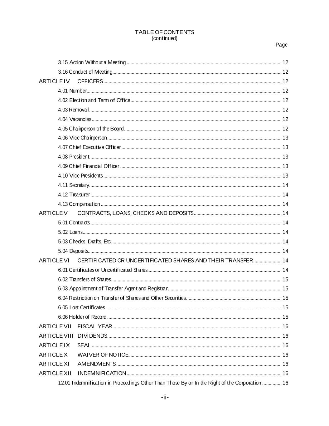TABLE OF CONTENTS (continued) Page -ii- 3.15 Action Without a Meeting ........................................................................................................................ 12 3.16 Conduct of Meeting................................................................................................................................... 12 ARTICLE IV OFFICERS .......................................................................................................................................... 12 4.01 Number....................................................................................................................................................... 12 4.02 Election and Term of Office ..................................................................................................................... 12 4.03 Removal ..................................................................................................................................................... 12 4.04 Vacancies ................................................................................................................................................... 12 4.05 Chairperson of the Board .......................................................................................................................... 12 4.06 Vice Chairperson ....................................................................................................................................... 13 4.07 Chief Executive Officer ............................................................................................................................ 13 4.08 President..................................................................................................................................................... 13 4.09 Chief Financial Officer ............................................................................................................................. 13 4.10 Vice Presidents .......................................................................................................................................... 13 4.11 Secretary..................................................................................................................................................... 14 4.12 Treasurer .................................................................................................................................................... 14 4.13 Compensation ............................................................................................................................................ 14 ARTICLE V CONTRACTS, LOANS, CHECKS AND DEPOSITS .................................................................... 14 5.01 Contracts .................................................................................................................................................... 14 5.02 Loans .......................................................................................................................................................... 14 5.03 Checks, Drafts, Etc .................................................................................................................................... 14 5.04 Deposits...................................................................................................................................................... 14 ARTICLE VI CERTIFICATED OR UNCERTIFICATED SHARES AND THEIR TRANSFER...................... 14 6.01 Certificates or Uncertificated Shares........................................................................................................ 14 6.02 Transfers of Shares .................................................................................................................................... 15 6.03 Appointment of Transfer Agent and Registrar ........................................................................................ 15 6.04 Restriction on Transfer of Shares and Other Securities .......................................................................... 15 6.05 Lost Certificates......................................................................................................................................... 15 6.06 Holder of Record ....................................................................................................................................... 15 ARTICLE VII FISCAL YEAR ................................................................................................................................... 16 ARTICLE VIII DIVIDENDS ....................................................................................................................................... 16 ARTICLE IX SEAL ................................................................................................................................................... 16 ARTICLE X WAIVER OF NOTICE ...................................................................................................................... 16 ARTICLE XI AMENDMENTS ................................................................................................................................ 16 ARTICLE XII INDEMNIFICATION ........................................................................................................................ 16 12.01 Indemnification in Proceedings Other Than Those By or In the Right of the Corporation ............... 16