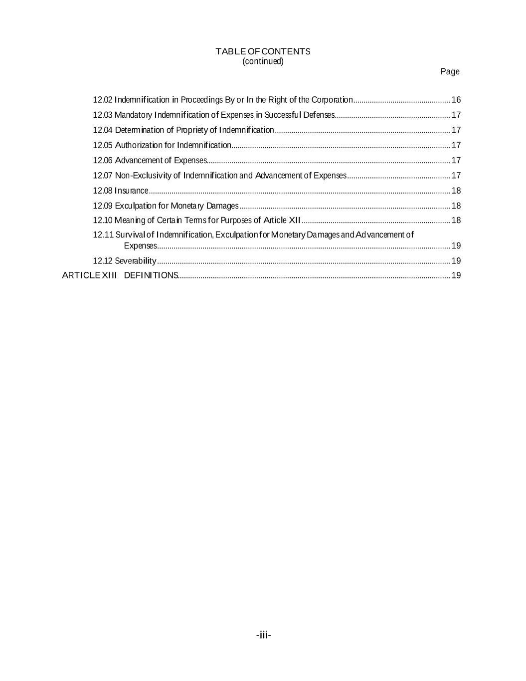 TABLE OF CONTENTS (continued) Page -iii- 12.02 Indemnification in Proceedings By or In the Right of the Corporation............................................... 16 12.03 Mandatory Indemnification of Expenses in Successful Defenses........................................................ 17 12.04 Determination of Propriety of Indemnification ..................................................................................... 17 12.05 Authorization for Indemnification.......................................................................................................... 17 12.06 Advancement of Expenses...................................................................................................................... 17 12.07 Non-Exclusivity of Indemnification and Advancement of Expenses .................................................. 17 12.08 Insurance .................................................................................................................................................. 18 12.09 Exculpation for Monetary Damages ...................................................................................................... 18 12.10 Meaning of Certain Terms for Purposes of Article XII ........................................................................ 18 12.11 Survival of Indemnification, Exculpation for Monetary Damages and Advancement of Expenses .............................................................................................................................................. 19 12.12 Severability .............................................................................................................................................. 19 ARTICLE XIII DEFINITIONS.................................................................................................................................... 19