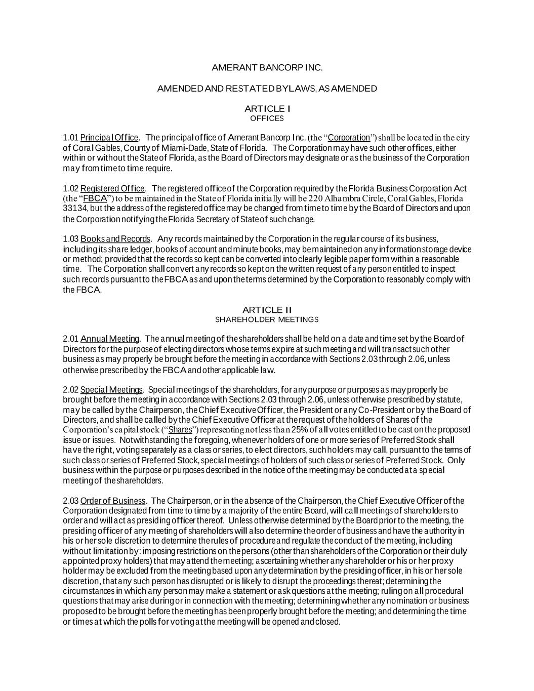 AMERANT BANCORP INC. AMENDED AND RESTATED BYLAWS, AS AMENDED ARTICLE I OFFICES 1.01 Principal Office. The principal office of Amerant Bancorp Inc. (the “Corporation”) shall be located in the city of Coral Gables, County of Miami-Dade, State of Florida. The Corporation may have such other offices, either within or without the State of Florida, as the Board of Directors may designate or as the business of the Corporation may from time to time require. 1.02 Registered Office. The registered office of the Corporation required by the Florida Business Corporation Act (the “FBCA”) to be maintained in the State of Florida initially will be 220 Alhambra Circle, Coral Gables, Florida 33134, but the address of the registered office may be changed from time to time by the Board of Directors and upon the Corporation notifying the Florida Secretary of State of such change. 1.03 Books and Records. Any records maintained by the Corporation in the regular course of its business, including its share ledger, books of account and minute books, may be maintained on any information storage device or method; provided that the records so kept can be converted into clearly legible paper form within a reasonable time. The Corporation shall convert any records so kept on the written request of any person entitled to inspect such records pursuant to the FBCA as and upon the terms determined by the Corporation to reasonably comply with the FBCA. ARTICLE II SHAREHOLDER MEETINGS 2.01 Annual Meeting. The annual meeting of the shareholders shall be held on a date and time set by the Board of Directors for the purpose of electing directors whose terms expire at such meeting and will transact such other business as may properly be brought before the meeting in accordance with Sections 2.03 through 2.06, unless otherwise prescribed by the FBCA and other applicable law. 2.02 Special Meetings. Special meetings of the shareholders, for any purpose or purposes as may properly be brought before the meeting in accordance with Sections 2.03 through 2.06, unless otherwise prescribed by statute, may be called by the Chairperson, the Chief Executive Officer, the President or any Co-President or by the Board of Directors, and shall be called by the Chief Executive Officer at the request of the holders of Shares of the Corporation’s capital stock (“Shares”) representing not less than 25% of all votes entitled to be cast on the proposed issue or issues. Notwithstanding the foregoing, whenever holders of one or more series of Preferred Stock shall have the right, voting separately as a class or series, to elect directors, such holders may call, pursuant to the terms of such class or series of Preferred Stock, special meetings of holders of such class or series of Preferred Stock. Only business within the purpose or purposes described in the notice of the meeting may be conducted at a special meeting of the shareholders. 2.03 Order of Business. The Chairperson, or in the absence of the Chairperson, the Chief Executive Officer of the Corporation designated from time to time by a majority of the entire Board, will call meetings of shareholders to order and will act as presiding officer thereof. Unless otherwise determined by the Board prior to the meeting, the presiding officer of any meeting of shareholders will also determine the order of business and have the authority in his or her sole discretion to determine the rules of procedure and regulate the conduct of the meeting, including without limitation by: imposing restrictions on the persons (other than shareholders of the Corporation or their duly appointed proxy holders) that may attend the meeting; ascertaining whether any shareholder or his or her proxy holder may be excluded from the meeting based upon any determination by the presiding officer, in his or her sole discretion, that any such person has disrupted or is likely to disrupt the proceedings thereat; determining the circumstances in which any person may make a statement or ask questions at the meeting; ruling on all procedural questions that may arise during or in connection with the meeting; determining whether any nomination or business proposed to be brought before the meeting has been properly brought before the meeting; and determining the time or times at which the polls for voting at the meeting will be opened and closed.