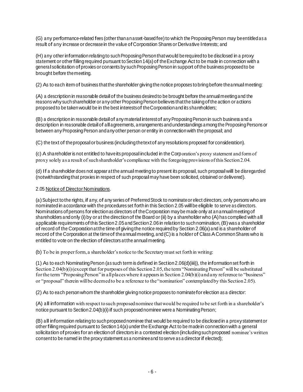 - 6 - (G) any performance-related fees (other than an asset-based fee) to which the Proposing Person may be entitled as a result of any increase or decrease in the value of Corporation Shares or Derivative Interests; and (H) any other information relating to such Proposing Person that would be required to be disclosed in a proxy statement or other filing required pursuant to Section 14(a) of the Exchange Act to be made in connection with a general solicitation of proxies or consents by such Proposing Person in support of the business proposed to be brought before the meeting. (2) As to each item of business that the shareholder giving the notice proposes to bring before the annual meeting: (A) a description in reasonable detail of the business desired to be brought before the annual meeting and the reasons why such shareholder or any other Proposing Person believes that the taking of the action or actions proposed to be taken would be in the best interests of the Corporation and its shareholders; (B) a description in reasonable detail of any material interest of any Proposing Person in such business and a description in reasonable detail of all agreements, arrangements and understandings among the Proposing Persons or between any Proposing Person and any other person or entity in connection with the proposal; and (C) the text of the proposal or business (including the text of any resolutions proposed for consideration). (c) A shareholder is not entitled to have its proposal included in the Corporation’s proxy statement and form of proxy solely as a result of such shareholder’s compliance with the foregoing provisions of this Section 2.04. (d) If a shareholder does not appear at the annual meeting to present its proposal, such proposal will be disregarded (notwithstanding that proxies in respect of such proposal may have been solicited, obtained or delivered). 2.05 Notice of Director Nominations. (a) Subject to the rights, if any, of any series of Preferred Stock to nominate or elect directors, only persons who are nominated in accordance with the procedures set forth in this Section 2.05 will be eligible to serve as directors. Nominations of persons for election as directors of the Corporation may be made only at an annual meeting of shareholders and only (i) by or at the direction of the Board or (ii) by a shareholder who (A) has complied with all applicable requirements of this Section 2.05 and Section 2.06 in relation to such nomination, (B) was a shareholder of record of the Corporation at the time of giving the notice required by Section 2.06(a) and is a shareholder of record of the Corporation at the time of the annual meeting, and (C) is a holder of Class A Common Shares who is entitled to vote on the election of directors at the annual meeting. (b) To be in proper form, a shareholder’s notice to the Secretary must set forth in writing: (1) As to each Nominating Person (as such term is defined in Section 2.06(d)(iii)), the information set forth in Section 2.04(b)(i) (except that for purposes of this Section 2.05, the term “Nominating Person” will be substituted for the term “Proposing Person” in all places where it appears in Section 2.04(b)(i) and any reference to “business” or “proposal” therein will be deemed to be a reference to the “nomination” contemplated by this Section 2.05). (2) As to each person whom the shareholder giving notice proposes to nominate for election as a director: (A) all information with respect to such proposed nominee that would be required to be set forth in a shareholder’s notice pursuant to Section 2.04(b)(i) if such proposed nominee were a Nominating Person; (B) all information relating to such proposed nominee that would be required to be disclosed in a proxy statement or other filing required pursuant to Section 14(a) under the Exchange Act to be made in connection with a general solicitation of proxies for an election of directors in a contested election (including such proposed nominee’s written consent to be named in the proxy statement as a nominee and to serve as a director if elected);