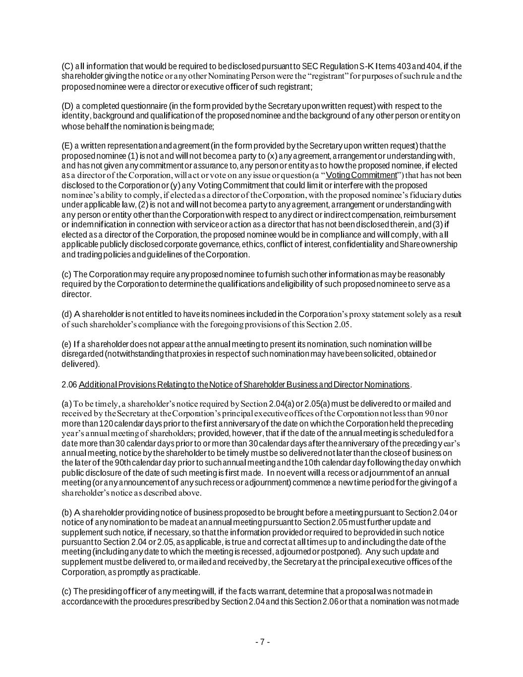 - 7 - (C) all information that would be required to be disclosed pursuant to SEC Regulation S-K Items 403 and 404, if the shareholder giving the notice or any other Nominating Person were the “registrant” for purposes of such rule and the proposed nominee were a director or executive officer of such registrant; (D) a completed questionnaire (in the form provided by the Secretary upon written request) with respect to the identity, background and qualification of the proposed nominee and the background of any other person or entity on whose behalf the nomination is being made; (E) a written representation and agreement (in the form provided by the Secretary upon written request) that the proposed nominee (1) is not and will not become a party to (x) any agreement, arrangement or understanding with, and has not given any commitment or assurance to, any person or entity as to how the proposed nominee, if elected as a director of the Corporation, will act or vote on any issue or question (a “Voting Commitment”) that has not been disclosed to the Corporation or (y) any Voting Commitment that could limit or interfere with the proposed nominee’s ability to comply, if elected as a director of the Corporation, with the proposed nominee’s fiduciary duties under applicable law, (2) is not and will not become a party to any agreement, arrangement or understanding with any person or entity other than the Corporation with respect to any direct or indirect compensation, reimbursement or indemnification in connection with service or action as a director that has not been disclosed therein, and (3) if elected as a director of the Corporation, the proposed nominee would be in compliance and will comply, with all applicable publicly disclosed corporate governance, ethics, conflict of interest, confidentiality and Share ownership and trading policies and guidelines of the Corporation. (c) The Corporation may require any proposed nominee to furnish such other information as may be reasonably required by the Corporation to determine the qualifications and eligibility of such proposed nominee to serve as a director. (d) A shareholder is not entitled to have its nominees included in the Corporation’s proxy statement solely as a result of such shareholder’s compliance with the foregoing provisions of this Section 2.05. (e) If a shareholder does not appear at the annual meeting to present its nomination, such nomination will be disregarded (notwithstanding that proxies in respect of such nomination may have been solicited, obtained or delivered). 2.06 Additional Provisions Relating to the Notice of Shareholder Business and Director Nominations. (a) To be timely, a shareholder’s notice required by Section 2.04(a) or 2.05(a) must be delivered to or mailed and received by the Secretary at the Corporation’s principal executive offices of the Corporation not less than 90 nor more than 120 calendar days prior to the first anniversary of the date on which the Corporation held the preceding year’s annual meeting of shareholders; provided, however, that if the date of the annual meeting is scheduled for a date more than 30 calendar days prior to or more than 30 calendar days after the anniversary of the preceding y ear’s annual meeting, notice by the shareholder to be timely must be so delivered not later than the close of business on the later of the 90th calendar day prior to such annual meeting and the 10th calendar day following the day on which public disclosure of the date of such meeting is first made. In no event will a recess or adjournment of an annual meeting (or any announcement of any such recess or adjournment) commence a new time period for the giving of a shareholder’s notice as described above. (b) A shareholder providing notice of business proposed to be brought before a meeting pursuant to Section 2.04 or notice of any nomination to be made at an annual meeting pursuant to Section 2.05 must further update and supplement such notice, if necessary, so that the information provided or required to be provided in such notice pursuant to Section 2.04 or 2.05, as applicable, is true and correct at all times up to and including the date of the meeting (including any date to which the meeting is recessed, adjourned or postponed). Any such update and supplement must be delivered to, or mailed and received by, the Secretary at the principal executive offices of the Corporation, as promptly as practicable. (c) The presiding officer of any meeting will, if the facts warrant, determine that a proposal was not made in accordance with the procedures prescribed by Section 2.04 and this Section 2.06 or that a nomination was not made