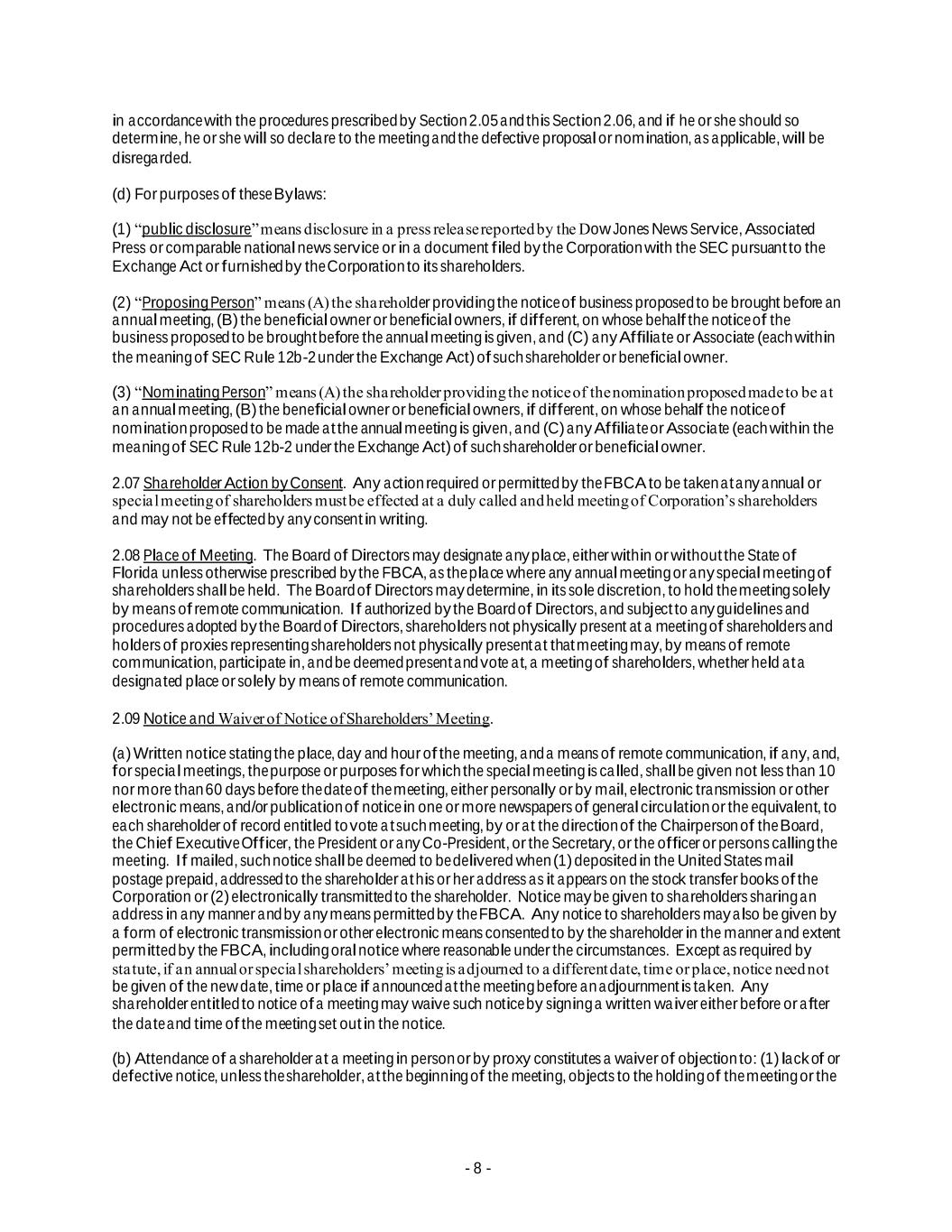 - 8 - in accordance with the procedures prescribed by Section 2.05 and this Section 2.06, and if he or she should so determine, he or she will so declare to the meeting and the defective proposal or nomination, as applicable, will be disregarded. (d) For purposes of these Bylaws: (1) “public disclosure” means disclosure in a press release reported by the Dow Jones News Service, Associated Press or comparable national news service or in a document filed by the Corporation with the SEC pursuant to the Exchange Act or furnished by the Corporation to its shareholders. (2) “Proposing Person” means (A) the shareholder providing the notice of business proposed to be brought before an annual meeting, (B) the beneficial owner or beneficial owners, if different, on whose behalf the notice of the business proposed to be brought before the annual meeting is given, and (C) any Affiliate or Associate (each within the meaning of SEC Rule 12b-2 under the Exchange Act) of such shareholder or beneficial owner. (3) “Nominating Person” means (A) the shareholder providing the notice of the nomination proposed made to be at an annual meeting, (B) the beneficial owner or beneficial owners, if different, on whose behalf the notice of nomination proposed to be made at the annual meeting is given, and (C) any Affiliate or Associate (each within the meaning of SEC Rule 12b-2 under the Exchange Act) of such shareholder or beneficial owner. 2.07 Shareholder Action by Consent. Any action required or permitted by the FBCA to be taken at any annual or special meeting of shareholders must be effected at a duly called and held meeting of Corporation’s shareholders and may not be effected by any consent in writing. 2.08 Place of Meeting. The Board of Directors may designate any place, either within or without the State of Florida unless otherwise prescribed by the FBCA, as the place where any annual meeting or any special meeting of shareholders shall be held. The Board of Directors may determine, in its sole discretion, to hold the meeting solely by means of remote communication. If authorized by the Board of Directors, and subject to any guidelines and procedures adopted by the Board of Directors, shareholders not physically present at a meeting of shareholders and holders of proxies representing shareholders not physically present at that meeting may, by means of remote communication, participate in, and be deemed present and vote at, a meeting of shareholders, whether held at a designated place or solely by means of remote communication. 2.09 Notice and Waiver of Notice of Shareholders’ Meeting. (a) Written notice stating the place, day and hour of the meeting, and a means of remote communication, if any, and, for special meetings, the purpose or purposes for which the special meeting is called, shall be given not less than 10 nor more than 60 days before the date of the meeting, either personally or by mail, electronic transmission or other electronic means, and/or publication of notice in one or more newspapers of general circulation or the equivalent, to each shareholder of record entitled to vote a t such meeting, by or at the direction of the Chairperson of the Board, the Chief Executive Officer, the President or any Co-President, or the Secretary, or the officer or persons calling the meeting. If mailed, such notice shall be deemed to be delivered when (1) deposited in the United States mail postage prepaid, addressed to the shareholder at his or her address as it appears on the stock transfer books of the Corporation or (2) electronically transmitted to the shareholder. Notice may be given to shareholders sharing an address in any manner and by any means permitted by the FBCA. Any notice to shareholders may also be given by a form of electronic transmission or other electronic means consented to by the shareholder in the manner and extent permitted by the FBCA, including oral notice where reasonable under the circumstances. Except as required by statute, if an annual or special shareholders’ meeting is adjourned to a different date, time or place, notice need not be given of the new date, time or place if announced at the meeting before an adjournment is taken. Any shareholder entitled to notice of a meeting may waive such notice by signing a written waiver either before or after the date and time of the meeting set out in the notice. (b) Attendance of a shareholder at a meeting in person or by proxy constitutes a waiver of objection to: (1) lack of or defective notice, unless the shareholder, at the beginning of the meeting, objects to the holding of the meeting or the