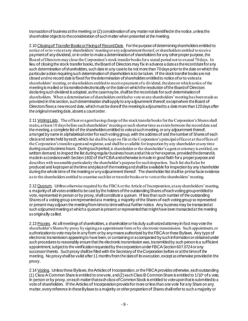- 9 - transaction of business at the meeting; or (2) consideration of any matter not identified in the notice, unless the shareholder objects to the consideration of such matter when presented at the meeting. 2.10 Closing of Transfer Books or Fixing of Record Date. For the purpose of determining shareholders entitled to notice of or to vote at any shareholders’ meeting or any adjournment thereof, or shareholders entitled to receive payment of any dividend, or in order to make a determination of shareholders for any other proper purpose, the Board of Directors may close the Corporation’s stock transfer books for a stated period not to exceed 70 days. In lieu of closing the stock transfer books, the Board of Directors may fix in advance a date as the record date for any such determination of shareholders, such date in any case to be not more than 70 days prior to the date on which the particular action requiring such determination of shareholders is to be taken. If the stock transfer books are not closed and no record date is fixed for the determination of shareholders entitled to notice of or to vote at a shareholders’ meeting, or shareholders entitled to receive payment of a dividend, the date on which notice of the meeting is mailed or transmitted electronically or the date on which the resolution of the Board of Directors declaring such dividend is adopted, as the case may be, shall be the record date for such determination of shareholders. When a determination of shareholders entitled to vote at any shareholders’ meeting has been made as provided in this section, such determination shall apply to any adjournment thereof, except where the Board of Directors fixes a new record date, which must be done if the meeting is adjourned to a date more than 120 days after the original meeting date, absent a court order. 2.11 Voting Lists. The officer or agent having charge of the stock transfer books for the Corporation’s Shares shall make, at least 10 days before each shareholders’ meeting or such shorter time as exists between the record date and the meeting, a complete list of the shareholders entitled to vote at such meeting, or any adjournment thereof, arranged by name in alphabetical order for each voting group, with the address of and the number of Shares of each class and series held by each, which list shall be kept on file at the Corporation’s principal office or at the offices of the Corporation’s transfer agent and registrar, and shall be available for inspection by any shareholder at any time during usual business hours. During such period, a shareholder or the shareholder’s agent or attorney is entitled, on written demand, to inspect the list during regular business hours and at his or her expense, provided the demand is made in accordance with Section 1602 of the FCBA and otherwise is made in good faith for a proper purpose and describes with reasonable particularity the shareholder’s purpose for such inspection. Such list shall also be produced and kept open at the time and place of the meeting and shall be available for inspection by any shareholder during the whole time of the meeting or any adjournment thereof. The shareholder list shall be prima facie evidence as to the shareholders entitled to examine such list or transfer books or to vote at the shareholders’ meeting. 2.12 Quorum. Unless otherwise required by the FBCA or the Article of Incorporation, at any shareholders’ meeting, a majority of all votes entitled to be cast by the holders of the outstanding Shares of each voting group entitled to vote, represented in person or by proxy, shall constitute a quorum. If less than such number of the outstanding Shares of a voting group are represented at a meeting, a majority of the Shares of each voting group so represented or present may adjourn the meeting from time to time without further notice. Any business may be transacted at such adjourned meeting at which a quorum is present or represented that might have been transacted at the meeting as originally called. 2.13 Proxies. At all meetings of shareholders, a shareholder or his duly authorized attorney in fact may vote the shareholder’s Shares by proxy by signing an appointment form or by electronic transmission. Such appointment, or authorization to vote may be in any form or by any means authorized by the FBCA or these Bylaws. Any type of electronic transmission appearing to have been, or containing or accompanied by such information or obtained under such procedures to reasonably ensure that the electronic transmission was, transmitted by such person is a sufficient appointment, subject to the verification requested by the corporation under FBCA Section 607.0724 or any successor thereto. Such proxy shall be filed with the Secretary of the Corporation before or at the time of the meeting. No proxy shall be valid after 11 months from the date of its execution, except as otherwise provided in the proxy. 2.14 Voting. Unless these Bylaws, the Articles of Incorporation, or the FBCA provides otherwise, each outstanding (1) Class A Common Share is entitled to one vote, and (2) each Class B Common Share is entitled to 1/10th of a vote, in person or by proxy, on each matter that each class of Common Stock is entitled to vote upon that is submitted to a vote of shareholders. If the Articles of Incorporation provide for more or less than one vote for any Share on any matter, every reference in these Bylaws to a majority or other proportion of Shares shall refer to such a majority or