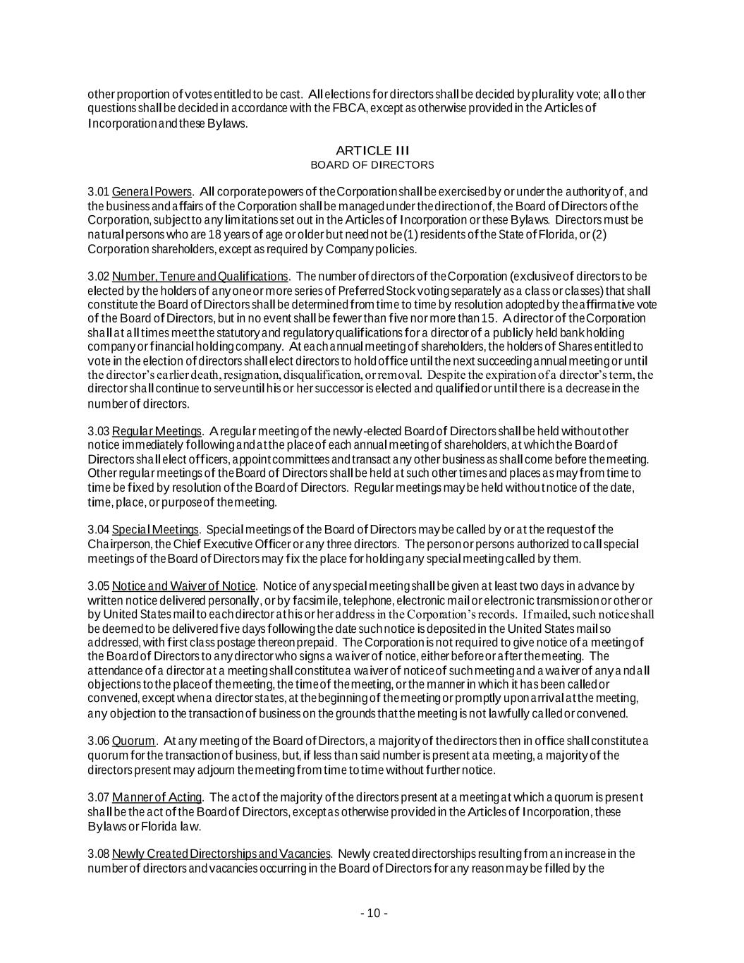 - 10 - other proportion of votes entitled to be cast. All elections for directors shall be decided by plurality vote; all o ther questions shall be decided in accordance with the FBCA, except as otherwise provided in the Articles of Incorporation and these Bylaws. ARTICLE III BOARD OF DIRECTORS 3.01 General Powers. All corporate powers of the Corporation shall be exercised by or under the authority of, and the business and affairs of the Corporation shall be managed under the direction of, the Board of Directors of the Corporation, subject to any limitations set out in the Articles of Incorporation or these Bylaws. Directors must be natural persons who are 18 years of age or older but need not be (1) residents of the State of Florida, or (2) Corporation shareholders, except as required by Company policies. 3.02 Number, Tenure and Qualifications. The number of directors of the Corporation (exclusive of directors to be elected by the holders of any one or more series of Preferred Stock voting separately as a class or classes) that shall constitute the Board of Directors shall be determined from time to time by resolution adopted by the affirmative vote of the Board of Directors, but in no event shall be fewer than five nor more than 15. A director of the Corporation shall at all times meet the statutory and regulatory qualifications for a director of a publicly held bank holding company or financial holding company. At each annual meeting of shareholders, the holders of Shares entitled to vote in the election of directors shall elect directors to hold office until the next succeeding annual meeting or until the director’s earlier death, resignation, disqualification, or removal. Despite the expiration of a director’s term, the director shall continue to serve until his or her successor is elected and qualified or until there is a decrease in the number of directors. 3.03 Regular Meetings. A regular meeting of the newly-elected Board of Directors shall be held without other notice immediately following and at the place of each annual meeting of shareholders, at which the Board of Directors shall elect officers, appoint committees and transact any other business as shall come before the meeting. Other regular meetings of the Board of Directors shall be held at such other times and places as may from time to time be fixed by resolution of the Board of Directors. Regular meetings may be held withou t notice of the date, time, place, or purpose of the meeting. 3.04 Special Meetings. Special meetings of the Board of Directors may be called by or at the request of the Chairperson, the Chief Executive Officer or any three directors. The person or persons authorized to call special meetings of the Board of Directors may fix the place for holding any special meeting called by them. 3.05 Notice and Waiver of Notice. Notice of any special meeting shall be given at least two days in advance by written notice delivered personally, or by facsimile, telephone, electronic mail or electronic transmission or other or by United States mail to each director at his or her address in the Corporation’s records. If mailed, such notice shall be deemed to be delivered five days following the date such notice is deposited in the United States mail so addressed, with first class postage thereon prepaid. The Corporation is not required to give notice of a meeting of the Board of Directors to any director who signs a waiver of notice, either before or after the meeting. The attendance of a director at a meeting shall constitute a waiver of notice of such meeting and a waiver of any a nd all objections to the place of the meeting, the time of the meeting, or the manner in which it has been called or convened, except when a director states, at the beginning of the meeting or promptly upon arrival at the meeting, any objection to the transaction of business on the grounds that the meeting is not lawfully called or convened. 3.06 Quorum. At any meeting of the Board of Directors, a majority of the directors then in office shall constitute a quorum for the transaction of business, but, if less than said number is present at a meeting, a majority of the directors present may adjourn the meeting from time to time without further notice. 3.07 Manner of Acting. The act of the majority of the directors present at a meeting at which a quorum is present shall be the act of the Board of Directors, except as otherwise provided in the Articles of Incorporation, these Bylaws or Florida law. 3.08 Newly Created Directorships and Vacancies. Newly created directorships resulting from an increase in the number of directors and vacancies occurring in the Board of Directors for any reason may be filled by the