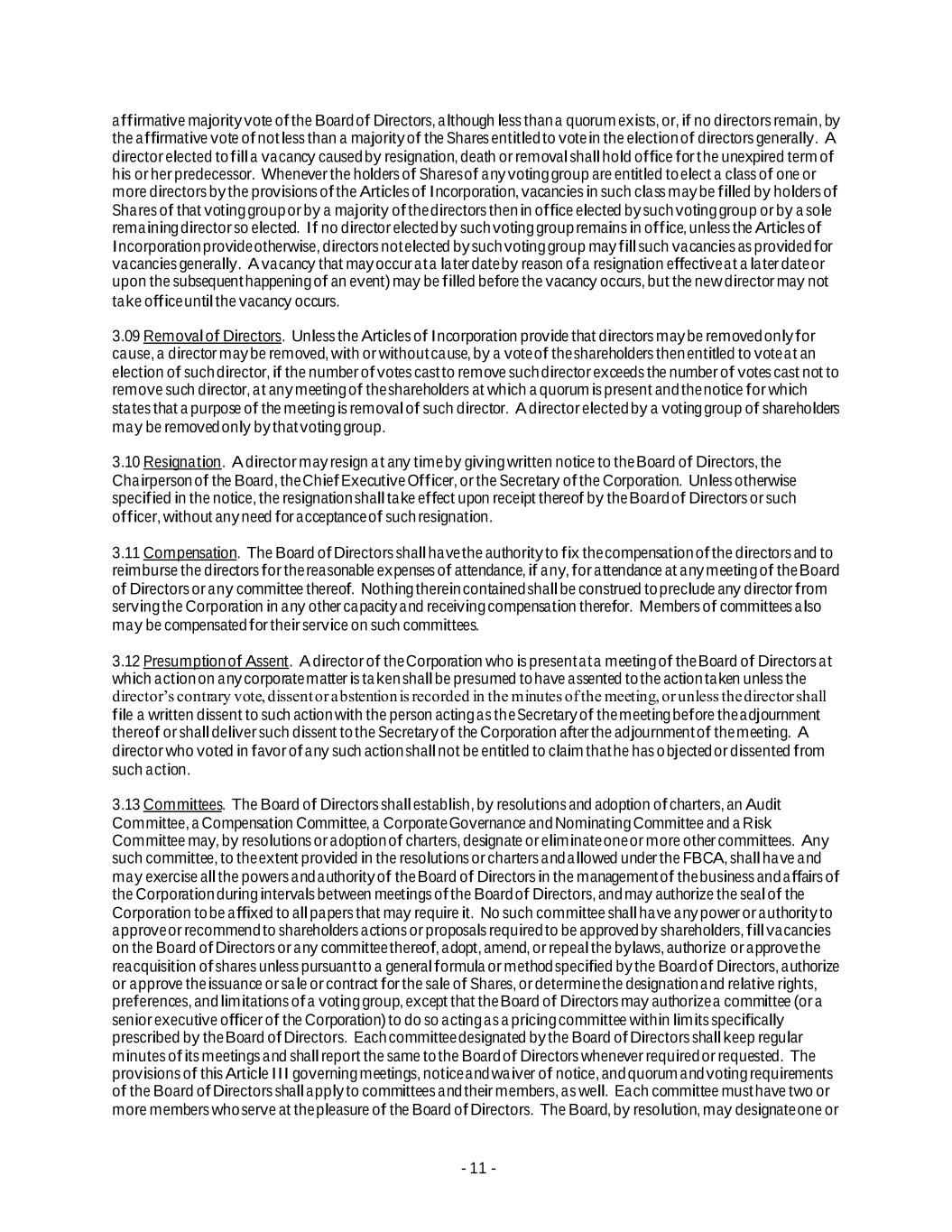 - 11 - affirmative majority vote of the Board of Directors, although less than a quorum exists, or, if no directors remain, by the affirmative vote of not less than a majority of the Shares entitled to vote in the election of directors generally. A director elected to fill a vacancy caused by resignation, death or removal shall hold office for the unexpired term of his or her predecessor. Whenever the holders of Shares of any voting group are entitled to elect a class of one or more directors by the provisions of the Articles of Incorporation, vacancies in such class may be filled by holders of Shares of that voting group or by a majority of the directors then in office elected by such voting group or by a sole remaining director so elected. If no director elected by such voting group remains in office, unless the Articles of Incorporation provide otherwise, directors not elected by such voting group may fill such vacancies as provided for vacancies generally. A vacancy that may occur at a later date by reason of a resignation effective at a later date or upon the subsequent happening of an event) may be filled before the vacancy occurs, but the new director may not take office until the vacancy occurs. 3.09 Removal of Directors. Unless the Articles of Incorporation provide that directors may be removed only for cause, a director may be removed, with or without cause, by a vote of the shareholders then entitled to vote at an election of such director, if the number of votes cast to remove such director exceeds the number of votes cast not to remove such director, at any meeting of the shareholders at which a quorum is present and the notice for which states that a purpose of the meeting is removal of such director. A director elected by a voting group of shareholders may be removed only by that voting group. 3.10 Resignation. A director may resign a t any time by giving written notice to the Board of Directors, the Chairperson of the Board, the Chief Executive Officer, or the Secretary of the Corporation. Unless otherwise specified in the notice, the resignation shall take effect upon receipt thereof by the Board of Directors or such officer, without any need for acceptance of such resignation. 3.11 Compensation. The Board of Directors shall have the authority to fix the compensation of the directors and to reimburse the directors for the reasonable expenses of attendance, if any, for attendance at any meeting of the Board of Directors or any committee thereof. Nothing therein contained shall be construed to preclude any director from serving the Corporation in any other capacity and receiving compensation therefor. Members of committees also may be compensated for their service on such committees. 3.12 Presumption of Assent. A director of the Corporation who is present at a meeting of the Board of Directors at which action on any corporate matter is ta ken shall be presumed to have assented to the action taken unless the director’s contrary vote, dissent or abstention is recorded in the minutes of the meeting, or unless the director shall file a written dissent to such action with the person acting as the Secretary of the meeting before the adjournment thereof or shall deliver such dissent to the Secretary of the Corporation after the adjournment of the meeting. A director who voted in favor of any such action shall not be entitled to claim that he has objected or dissented from such action. 3.13 Committees. The Board of Directors shall establish, by resolutions and adoption of charters, an Audit Committee, a Compensation Committee, a Corporate Governance and Nominating Committee and a Risk Committee may, by resolutions or adoption of charters, designate or eliminate one or more other committees. Any such committee, to the extent provided in the resolutions or charters and allowed under the FBCA, shall have and may exercise all the powers and authority of the Board of Directors in the management of the business and affairs of the Corporation during intervals between meetings of the Board of Directors, and may authorize the seal of the Corporation to be affixed to all papers that may require it. No such committee shall have any power or authority to approve or recommend to shareholders actions or proposals required to be approved by shareholders, fill vacancies on the Board of Directors or any committee thereof, adopt, amend, or repeal the bylaws, authorize or approve the reacquisition of shares unless pursuant to a general formula or method specified by the Board of Directors, authorize or approve the issuance or sale or contract for the sale of Shares, or determine the designation and relative rights, preferences, and limitations of a voting group, except that the Board of Directors may authorize a committee (or a senior executive officer of the Corporation) to do so acting as a pricing committee within limits specifically prescribed by the Board of Directors. Each committee designated by the Board of Directors shall keep regular minutes of its meetings and shall report the same to the Board of Directors whenever required or requested. The provisions of this Article III governing meetings, notice and waiver of notice, and quorum and voting requirements of the Board of Directors shall apply to committees and their members, as well. Each committee must have two or more members who serve at the pleasure of the Board of Directors. The Board, by resolution, may designate one or