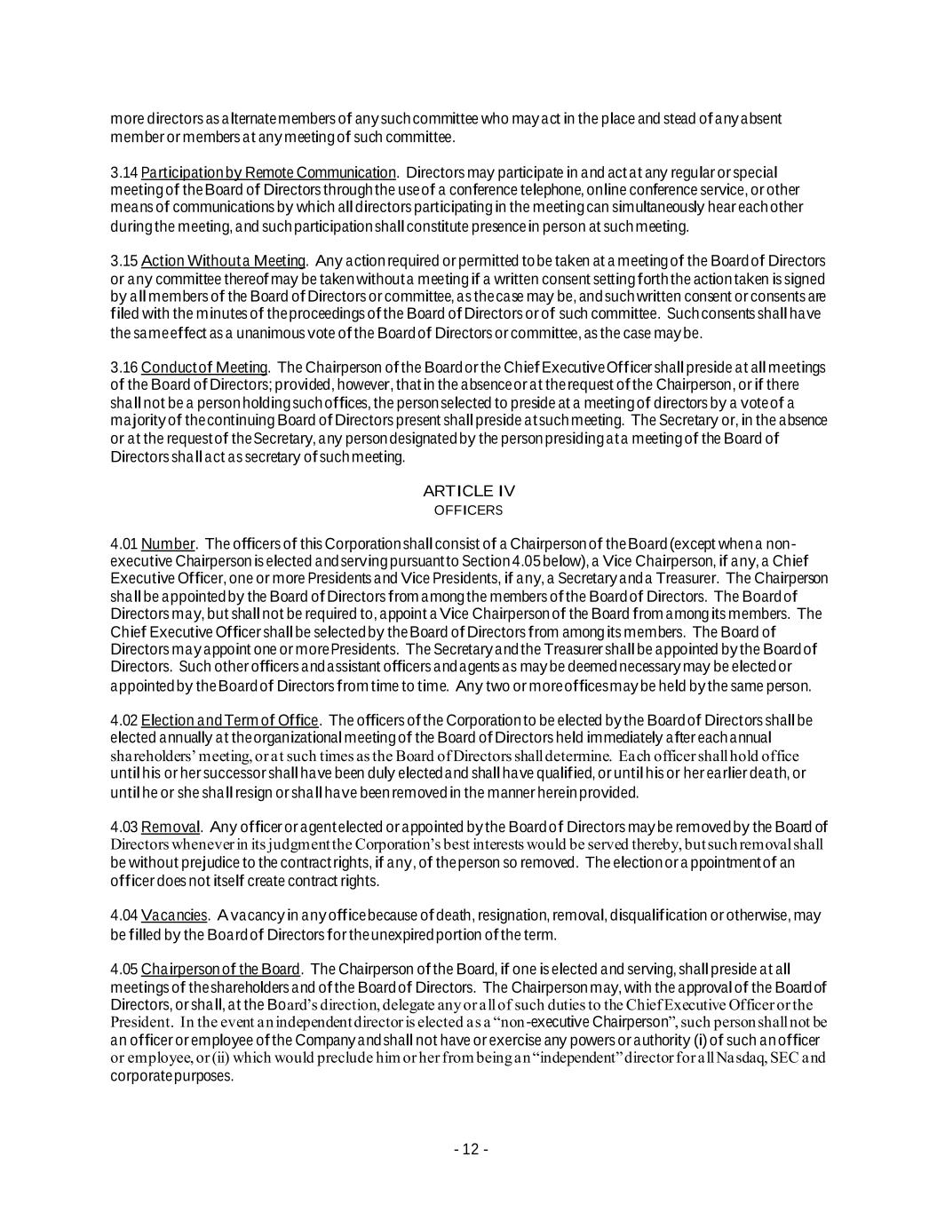 - 12 - more directors as alternate members of any such committee who may act in the place and stead of any absent member or members at any meeting of such committee. 3.14 Participation by Remote Communication. Directors may participate in and act at any regular or special meeting of the Board of Directors through the use of a conference telephone, online conference service, or other means of communications by which all directors participating in the meeting can simultaneously hear each other during the meeting, and such participation shall constitute presence in person at such meeting. 3.15 Action Without a Meeting. Any action required or permitted to be taken at a meeting of the Board of Directors or any committee thereof may be taken without a meeting if a written consent setting forth the action taken is signed by all members of the Board of Directors or committee, as the case may be, and such written consent or consents are filed with the minutes of the proceedings of the Board of Directors or of such committee. Such consents shall have the same effect as a unanimous vote of the Board of Directors or committee, as the case may be. 3.16 Conduct of Meeting. The Chairperson of the Board or the Chief Executive Officer shall preside at all meetings of the Board of Directors; provided, however, that in the absence or at the request of the Chairperson, or if there shall not be a person holding such offices, the person selected to preside at a meeting of directors by a vote of a majority of the continuing Board of Directors present shall preside at such meeting. The Secretary or, in the absence or at the request of the Secretary, any person designated by the person presiding at a meeting of the Board of Directors shall act as secretary of such meeting. ARTICLE IV OFFICERS 4.01 Number. The officers of this Corporation shall consist of a Chairperson of the Board (except when a non- executive Chairperson is elected and serving pursuant to Section 4.05 below), a Vice Chairperson, if any, a Chief Executive Officer, one or more Presidents and Vice Presidents, if any, a Secretary and a Treasurer. The Chairperson shall be appointed by the Board of Directors from among the members of the Board of Directors. The Board of Directors may, but shall not be required to, appoint a Vice Chairperson of the Board from among its members. The Chief Executive Officer shall be selected by the Board of Directors from among its members. The Board of Directors may appoint one or more Presidents. The Secretary and the Treasurer shall be appointed by the Board of Directors. Such other officers and assistant officers and agents as may be deemed necessary may be elected or appointed by the Board of Directors from time to time. Any two or more offices may be held by the same person. 4.02 Election and Term of Office. The officers of the Corporation to be elected by the Board of Directors shall be elected annually at the organizational meeting of the Board of Directors held immediately after each annual shareholders’ meeting, or at such times as the Board of Directors shall determine. Each officer shall hold office until his or her successor shall have been duly elected and shall have qualified, or until his or her earlier death, or until he or she shall resign or shall have been removed in the manner herein provided. 4.03 Removal. Any officer or agent elected or appointed by the Board of Directors may be removed by the Board of Directors whenever in its judgment the Corporation’s best interests would be served thereby, but such removal shall be without prejudice to the contract rights, if any, of the person so removed. The election or a ppointment of an officer does not itself create contract rights. 4.04 Vacancies. A vacancy in any office because of death, resignation, removal, disqualification or otherwise, may be filled by the Board of Directors for the unexpired portion of the term. 4.05 Chairperson of the Board. The Chairperson of the Board, if one is elected and serving, shall preside at all meetings of the shareholders and of the Board of Directors. The Chairperson may, with the approval of the Board of Directors, or shall, at the Board’s direction, delegate any or all of such duties to the Chief Executive Officer or the President. In the event an independent director is elected as a “non-executive Chairperson”, such person shall not be an officer or employee of the Company and shall not have or exercise any powers or authority (i) of such an officer or employee, or (ii) which would preclude him or her from being an “independent” director for all Nasdaq, SEC and corporate purposes.