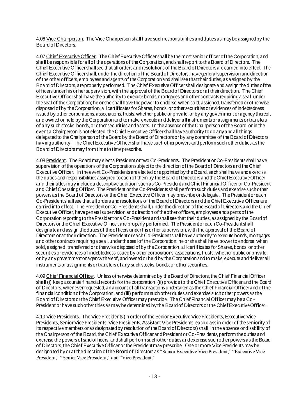 - 13 - 4.06 Vice Chairperson. The Vice Chairperson shall have such responsibilities and duties as may be assigned by the Board of Directors. 4.07 Chief Executive Officer. The Chief Executive Officer shall be the most senior officer of the Corporation, and shall be responsible for all of the operations of the Corporation, and shall report to the Board of Directors. The Chief Executive Officer shall see that all orders and resolutions of the Board of Directors are carried into effect. The Chief Executive Officer shall, under the direction of the Board of Directors, have general supervision and direction of the other officers, employees and agents of the Corporation and shall see that their duties, as assigned by the Board of Directors, are properly performed. The Chief Executive Officer shall designate and assign the duties of the officers under his or her supervision, with the approval of the Board of Directors or at their direction. The Chief Executive Officer shall have the authority to execute bonds, mortgages and other contracts requiring a seal, under the seal of the Corporation; he or she shall have the power to endorse, when sold, assigned, transferred or otherwise disposed of by the Corporation, all certificates for Shares, bonds, or other securities or evidences of indebtedness issued by other corporations, associations, trusts, whether public or private, or by any government or agency thereof, and owned or held by the Corporation and to make, execute and deliver all instruments or assignments or transfers of any such stocks, bonds, or other securities and assets. In the absence of the Chairperson of the Board, or in the event a Chairperson is not elected, the Chief Executive Officer shall have authority to do any and all things delegated to the Chairperson of the Board by the Board of Directors or by any committee of the Board of Directors having authority. The Chief Executive Officer shall have such other powers and perform such other duties as the Board of Directors may from time to time prescribe. 4.08 President. The Board may elect a President or two Co-Presidents. The President or Co-Presidents shall have supervision of the operations of the Corporation subject to the direction of the Board of Directors and the Chief Executive Officer. In the event Co-Presidents are elected or appointed by the Board, each shall have and exercise the duties and responsibilities assigned to each of them by the Board of Directors and the Chief Executive Officer and their titles may include a descriptive addition, such as Co-President and Chief Financial Officer or Co-President and Chief Operating Officer. The President or the Co-Presidents shall perform such duties and exercise such other powers as the Board of Directors or the Chief Executive Officer may prescribe or delegate. The President or each Co-President shall see that all orders and resolutions of the Board of Directors and the Chief Executive Officer are carried into effect. The President or Co-Presidents shall, under the direction of the Board of Directors and the Chief Executive Officer, have general supervision and direction of the other officers, employees and agents of the Corporation reporting to the President or a Co-President and shall see that their duties, as assigned by the Board of Directors or the Chief Executive Officer, are properly performed. The President or each Co-President shall designate and assign the duties of the officers under his or her supervision, with the approval of the Board of Directors or at their direction. The President or each Co-President shall have authority to execute bonds, mortgages and other contracts requiring a seal, under the seal of the Corporation; he or she shall have power to endorse, when sold, assigned, transferred or otherwise disposed of by the Corporation, all certificates for Shares, bonds, or other securities or evidences of indebtedness issued by other corporations, associations, trusts, whether public or private, or by any government or agency thereof, and owned or held by the Corporation and to make, execute and deliver all instruments or assignments or transfers of any such stocks, bonds, or other securities. 4.09 Chief Financial Officer. Unless otherwise determined by the Board of Directors, the Chief Financial Officer shall (i) keep accurate financial records for the corporation, (ii) provide to the Chief Executive Officer and the Board of Directors, whenever requested, an account of all transactions undertaken as the Chief Financial Officer and of the financial condition of the Corporation, and (iii) perform such other duties and exercise such other powers as the Board of Directors or the Chief Executive Officer may prescribe. The Chief Financial Officer may be a Co - President or have such other titles as may be determined by the Board of Directors or the Chief Executive Officer. 4.10 Vice Presidents. The Vice Presidents (in order of the Senior Executive Vice Presidents, Executive Vice Presidents, Senior Vice Presidents, Vice Presidents, Assistant Vice Presidents, each class in order of the seniority of its respective members or as designated by resolution of the Board of Directors) shall, in the absence or disability of the Chairperson of the Board, the Chief Executive Officer and President or Co-Presidents, perform the duties and exercise the powers of said officers, and shall perform such other duties and exercise such other powers as the Board of Directors, the Chief Executive Officer or the President may prescribe. One or more Vice Presidents may be designated by or at the direction of the Board of Directors as “Senior Executive Vice President,” “Executive Vice President,” “Senior Vice President,” and “Vice President.”