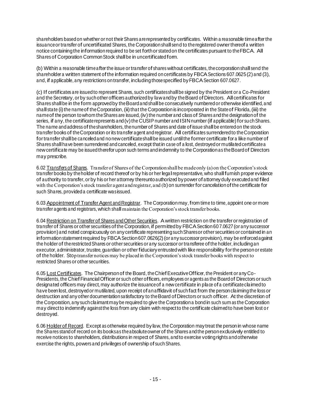 - 15 - shareholders based on whether or not their Shares are represented by certificates. Within a reasonable time after the issuance or transfer of uncertificated Shares, the Corporation shall send to the registered owner thereof a written notice containing the information required to be set forth or stated on the certificates pursuant to the FBCA. All Shares of Corporation Common Stock shall be in uncertificated form. (b) Within a reasonable time after the issue or transfer of shares without certificates, the corporation shall send the shareholder a written statement of the information required on certificates by FBCA Sections 607.0625 (2) and (3), and, if applicable, any restrictions on transfer, including those specified by FBCA Section 607.0627. (c) If certificates are issued to represent Shares, such certificates shall be signed by the President or a Co-President and the Secretary, or by such other officers authorized by law and by the Board of Directors. All certificates for Shares shall be in the form approved by the Board and shall be consecutively numbered or otherwise identified, and shall state (i) the name of the Corporation, (ii) that the Corporation is incorporated in the State of Florida, (iii) the name of the person to whom the Shares are issued, (iv) the number and class of Shares and the designation of the series, if any, the certificate represents and (v) the CUSIP number and ISIN number (if applicable) for such Shares. The name and address of the shareholders, the number of Shares and date of issue shall be entered on the stock transfer books of the Corporation or its transfer agent and registrar. All certificates surrendered to the Corporation for transfer shall be canceled and no new certificate shall be issued until the former certificate for a like number of Shares shall have been surrendered and canceled, except that in case of a lost, destroyed or mutilated certificate a new certificate may be issued therefor upon such terms and indemnity to the Corporation as the Board of Directors may prescribe. 6.02 Transfers of Shares. Transfer of Shares of the Corporation shall be made only (a) on the Corporation’s stock transfer books by the holder of record thereof or by his or her legal representative, who shall furnish proper evidence of authority to transfer, or by his or her attorney thereunto authorized by power of attorney duly executed and filed with the Corporation’s stock transfer agent and registrar, and (b) on surrender for cancelation of the certificate for such Shares, provided a certificate was issued. 6.03 Appointment of Transfer Agent and Registrar. The Corporation may, from time to time, appoint one or more transfer agents and registrars, which shall maintain the Corporation’s stock transfer books. 6.04 Restriction on Transfer of Shares and Other Securities. A written restriction on the transfer or registration of transfer of Shares or other securities of the Corporation, if permitted by FBCA Section 607.0627 (or any successor provision) and noted conspicuously on any certificate representing such Shares or other securities or contained in an information statement required by FBCA Section 607.0626(2) (or any successor provision), may be enforced against the holder of the restricted Shares or other securities or any successor or transferee of the holder, including an executor, administrator, trustee, guardian or other fiduciary entrusted with like responsibility for the person or estate of the holder. Stop transfer notices may be placed in the Corporation’s stock transfer books with respect to restricted Shares or other securities. 6.05 Lost Certificates. The Chairperson of the Board, the Chief Executive Officer, the President or any Co- Presidents, the Chief Financial Officer or such other officers, employees or agents as the Board of Directors or such designated officers may direct, may authorize the issuance of a new certificate in place of a certificate claimed to have been lost, destroyed or mutilated, upon receipt of an affidavit of such fact from the person claiming the loss or destruction and any other documentation satisfactory to the Board of Directors or such officer. At the discretion of the Corporation, any such claimant may be required to give the Corporation a bond in such sum as the Corporation may direct to indemnify against the loss from any claim with respect to the certificate claimed to have been lost o r destroyed. 6.06 Holder of Record. Except as otherwise required by law, the Corporation may treat the person in whose name the Shares stand of record on its books as the absolute owner of the Shares and the person exclusively entitled to receive notices to shareholders, distributions in respect of Shares, and to exercise voting rights and otherwise exercise the rights, powers and privileges of ownership of such Shares.