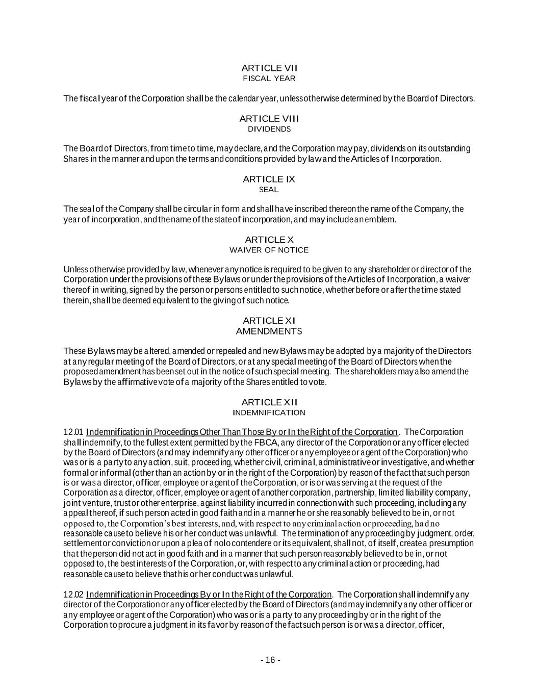 - 16 - ARTICLE VII FISCAL YEAR The fiscal year of the Corporation shall be the calendar year, unless otherwise determined by the Board of Directors. ARTICLE VIII DIVIDENDS The Board of Directors, from time to time, may declare, and the Corporation may pay, dividends on its outstanding Shares in the manner and upon the terms and conditions provided by law and the Articles of Incorporation. ARTICLE IX SEAL The seal of the Company shall be circular in form and shall have inscribed thereon the name of the Company, the year of incorporation, and the name of the state of incorporation, and may include an emblem. ARTICLE X WAIVER OF NOTICE Unless otherwise provided by law, whenever any notice is required to be given to any shareholder or director of the Corporation under the provisions of these Bylaws or under the provisions of the Articles of Incorporation, a waiver thereof in writing, signed by the person or persons entitled to such notice, whether before or after the time stated therein, shall be deemed equivalent to the giving of such notice. ARTICLE XI AMENDMENTS These Bylaws may be altered, amended or repealed and new Bylaws may be adopted by a majority of the Directors at any regular meeting of the Board of Directors, or at any special meeting of the Board of Directors when the proposed amendment has been set out in the notice of such special meeting. The shareholders may also amend the Bylaws by the affirmative vote of a majority of the Shares entitled to vote. ARTICLE XII INDEMNIFICATION 12.01 Indemnification in Proceedings Other Than Those By or In the Right of the Corporation . The Corporation shall indemnify, to the fullest extent permitted by the FBCA, any director of the Corporation or any officer elected by the Board of Directors (and may indemnify any other officer or any employee or agent of the Corporation) who was or is a party to any action, suit, proceeding, whether civil, criminal, administrative or investigative, and whether formal or informal (other than an action by or in the right of the Corporation) by reason of the fact that such person is or was a director, officer, employee or agent of the Corporation, or is or was serving at the request of the Corporation as a director, officer, employee or agent of another corporation, partnership, limited liability company, joint venture, trust or other enterprise, against liability incurred in connection with such proceeding, including any appeal thereof, if such person acted in good faith and in a manner he or she reasonably believed to be in, or not opposed to, the Corporation’s best interests, and, with respect to any criminal action or proceeding, had no reasonable cause to believe his or her conduct was unlawful. The termination of any proceeding by judgment, order, settlement or conviction or upon a plea of nolo contendere or its equivalent, shall not, of itself, create a presumption that the person did not act in good faith and in a manner that such person reasonably believed to be in, or not opposed to, the best interests of the Corporation, or, with respect to any criminal action or proceeding, had reasonable cause to believe that his or her conduct was unlawful. 12.02 Indemnification in Proceedings By or In the Right of the Corporation. The Corporation shall indemnify any director of the Corporation or any officer elected by the Board of Directors (and may indemnify any other officer or any employee or agent of the Corporation) who was or is a party to any proceeding by or in the right of the Corporation to procure a judgment in its favor by reason of the fact such person is or was a director, officer,