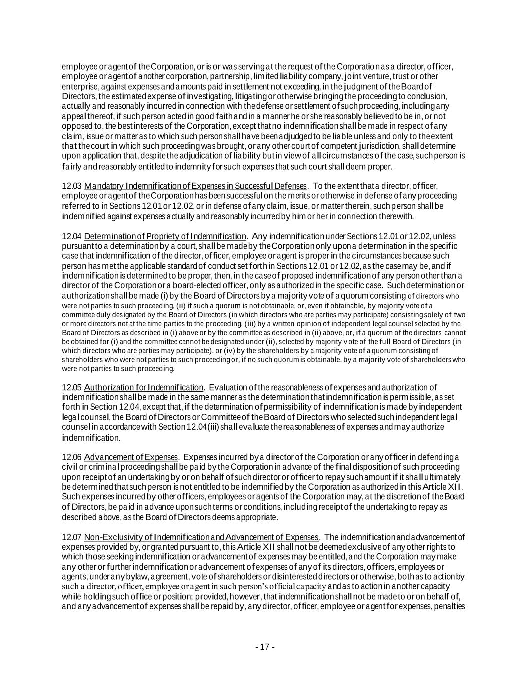 - 17 - employee or agent of the Corporation, or is or was serving at the request of the Corporation as a director, officer, employee or agent of another corporation, partnership, limited liability company, joint venture, trust or other enterprise, against expenses and amounts paid in settlement not exceeding, in the judgment of the Board of Directors, the estimated expense of investigating, litigating or otherwise bringing the proceeding to conclusion, actually and reasonably incurred in connection with the defense or settlement of such proceeding, including any appeal thereof, if such person acted in good faith and in a manner he or she reasonably believed to be in, or not opposed to, the best interests of the Corporation, except that no indemnification shall be made in respect of any claim, issue or matter as to which such person shall have been adjudged to be liable unless and only to the extent that the court in which such proceeding was brought, or any other court of competent jurisdiction, shall determine upon application that, despite the adjudication of liability but in view of all circumstances o f the case, such person is fairly and reasonably entitled to indemnity for such expenses that such court shall deem proper. 12.03 Mandatory Indemnification of Expenses in Successful Defenses. To the extent that a director, officer, employee or agent of the Corporation has been successful on the merits or otherwise in defense of any proceeding referred to in Sections 12.01 or 12.02, or in defense of any claim, issue, or matter therein, such person shall be indemnified against expenses actually and reasonably incurred by him or her in connection therewith. 12.04 Determination of Propriety of Indemnification. Any indemnification under Sections 12.01 or 12.02, unless pursuant to a determination by a court, shall be made by the Corporation only upon a determination in the specific case that indemnification of the director, officer, employee or agent is proper in the circumstances because such person has met the applicable standard of conduct set forth in Sections 12.01 or 12.02, as the case may be, and if indemnification is determined to be proper, then, in the case of proposed indemnification of any person other than a director of the Corporation or a board-elected officer, only as authorized in the specific case. Such determination or authorization shall be made (i) by the Board of Directors by a majority vote of a quorum consisting of directors who were not parties to such proceeding, (ii) if such a quorum is not obtainable, or, even if obtainable, by majority vote of a committee duly designated by the Board of Directors (in which directors who are parties may participate) consisting solely of two or more directors not at the time parties to the proceeding, (iii) by a written opinion of independent legal counsel selected by the Board of Directors as described in (i) above or by the committee as described in (ii) above, or, if a quorum of the directors cannot be obtained for (i) and the committee cannot be designated under (ii), selected by majority v ote of the full Board of Directors (in which directors who are parties may participate), or (iv) by the shareholders by a majority vote of a quorum consisting of shareholders who were not parties to such proceeding or, if no such quorum is obtainable, by a majority vote of shareholders who were not parties to such proceeding. 12.05 Authorization for Indemnification. Evaluation of the reasonableness of expenses and authorization of indemnification shall be made in the same manner as the determination that indemnification is permissible, as set forth in Section 12.04, except that, if the determination of permissibility of indemnification is made by independent legal counsel, the Board of Directors or Committee of the Board of Directors who selected such independent legal counsel in accordance with Section 12.04(iii) shall evaluate the reasonableness of expenses and may authorize indemnification. 12.06 Advancement of Expenses. Expenses incurred by a director of the Corporation or any officer in defending a civil or criminal proceeding shall be paid by the Corporation in advance of the final disposition of such proceeding upon receipt of an undertaking by or on behalf of such director or officer to repay such amount if it shall ultimately be determined that such person is not entitled to be indemnified by the Corporation as authorized in this Article XII. Such expenses incurred by other officers, employees or agents of the Corporation may, at the discretion of the Board of Directors, be paid in advance upon such terms or conditions, including receipt of the undertaking to repay as described above, as the Board of Directors deems appropriate. 12.07 Non-Exclusivity of Indemnification and Advancement of Expenses. The indemnification and advancement of expenses provided by, or granted pursuant to, this Article XII shall not be deemed exclusive of any other rights to which those seeking indemnification or advancement of expenses may be entitled, and the Corporation may make any other or further indemnification or advancement of expenses of any of its directors, officers, employees or agents, under any bylaw, agreement, vote of shareholders or disinterested directors or otherwise, both as to action by such a director, officer, employee or agent in such person’s official capacity and as to action in another capacity while holding such office or position; provided, however, that indemnification shall not be made to or on behalf of, and any advancement of expenses shall be repaid by, any director, officer, employee or agent for expenses, penalties