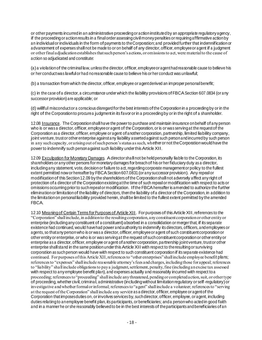 - 18 - or other payments incurred in an administrative proceeding or action instituted by an appropriate regulatory agency, if the proceeding or action results in a final order assessing civil money penalties or requiring affirmative action by an individual or individuals in the form of payments to the Corporation; and provided further that indemnification or advancement of expenses shall not be made to or on behalf of any director, officer, employee or agent if a judgment or other final adjudication establishes that such person’s actions, or omissions to act, were material to the cause of action so adjudicated and constitute: (a) a violation of the criminal law, unless the director, officer, employee or agent had reasonable cause to believe his or her conduct was lawful or had no reasonable cause to believe his or her conduct was unlawful; (b) a transaction from which the director, officer, employee or agent derived an improper personal benefit; (c) in the case of a director, a circumstance under which the liability provisions of FBCA Section 607.0834 (or any successor provision) are applicable; or (d) willful misconduct or a conscious disregard for the best interests of the Corporation in a proceeding by or in the right of the Corporation to procure a judgment in its favor or in a proceeding by or in the right of a shareholder. 12.08 Insurance. The Corporation shall have the power to purchase and maintain insurance on behalf of any person who is or was a director, officer, employee or agent of the Corporation, or is or was serving at the request of the Corporation as a director, officer, employee or agent of another corporation, partnership, limited liability company, joint venture, trust or other enterprise against any liability asserted against such person and incurred by such person in any such capacity, or arising out of such person’s status as such, whether or not the Corporation would have the power to indemnify such person against such liability under this Article XII. 12.09 Exculpation for Monetary Damages. A director shall not be held personally liable to the Corporation, its shareholders or any other persons for monetary damages for breach of his or her fiduciary duty as a director, including any statement, vote, decision or failure to act, regarding corporate management or policy to the fullest extent permitted now or hereafter by FBCA Section 607.0831 (or any successor provision). Any repeal or modification of this Section 12.09 by the shareholders of the Corporation shall not adversely affect any right of protection of a director of the Corporation existing at the time of such repeal or modification with respect to acts or omissions occurring prior to such repeal or modification. If the FBCA hereafter is amended to authorize the further elimination or limitation of the liability of directors, then the liability of a director of the Corporation, in addition to the limitation on personal liability provided herein, shall be limited to the fullest extent permitted by the amended FBCA. 12.10 Meaning of Certain Terms for Purposes of Article XII. For purposes of this Article XII, references to the “Corporation” shall include, in addition to the resulting corporation, any constituent corporation or other entity or enterprise (including any constituent of a constituent) absorbed in a consolidation or merger that, if its separate existence had continued, would have had power and authority to indemnify its directors, officers, and employees or agents, so that any person who is or was a director, officer, employee or agent of such constituent corporation or other entity or enterprise, or who is or was serving at the request of such constituent corporation or other entity or enterprise as a director, officer, employee or agent of another corporation, partnership joint venture, trust or other enterprise shall stand in the same position under this Article XII with respect to the resulting or surviving corporation as such person would have with respect to such constituent corporation if its separate existence had continued. For purposes of this Article XII, references to “other enterprises” shall include employee benefit plans; references to “expenses” shall include reasonable attorney’s fees and charges, including those for appeal; references to “liability” shall include obligations to pay a judgment, settlement, penalty, fine (including an excise tax assessed with respect to any employee benefit plan), and expenses actually and reasonably incurred with respect to a proceeding; references to “proceeding” shall include any threatened, pending or completed action, suit, or other type of proceeding, whether civil, criminal, administrative (including without limitation regulatory or self-regulatory) or investigative and whether formal or informal; references to “agent” shall include a volunteer; references to “serving at the request of the Corporation” shall include any service as a director, officer, employee or agent of the Corporation that imposes duties on, or involves services by, such director, officer, employee, or agent, including duties relating to an employee benefit plan, its participants, or beneficiaries; and a person who acted in good faith and in a manner he or she reasonably believed to be in the best interests of the participants and beneficiaries of an