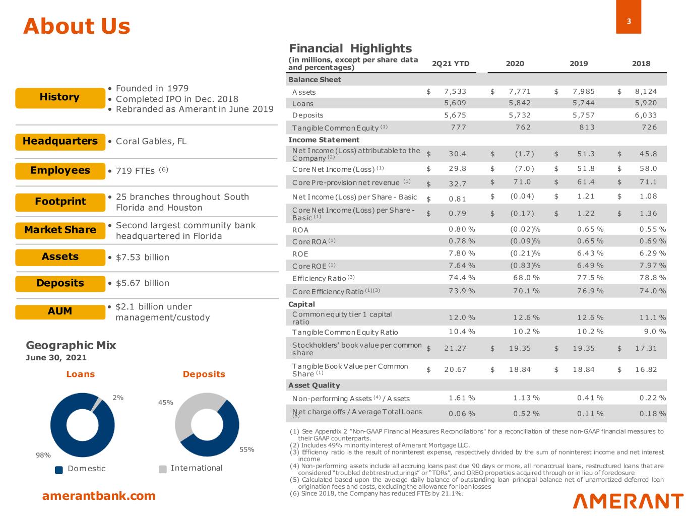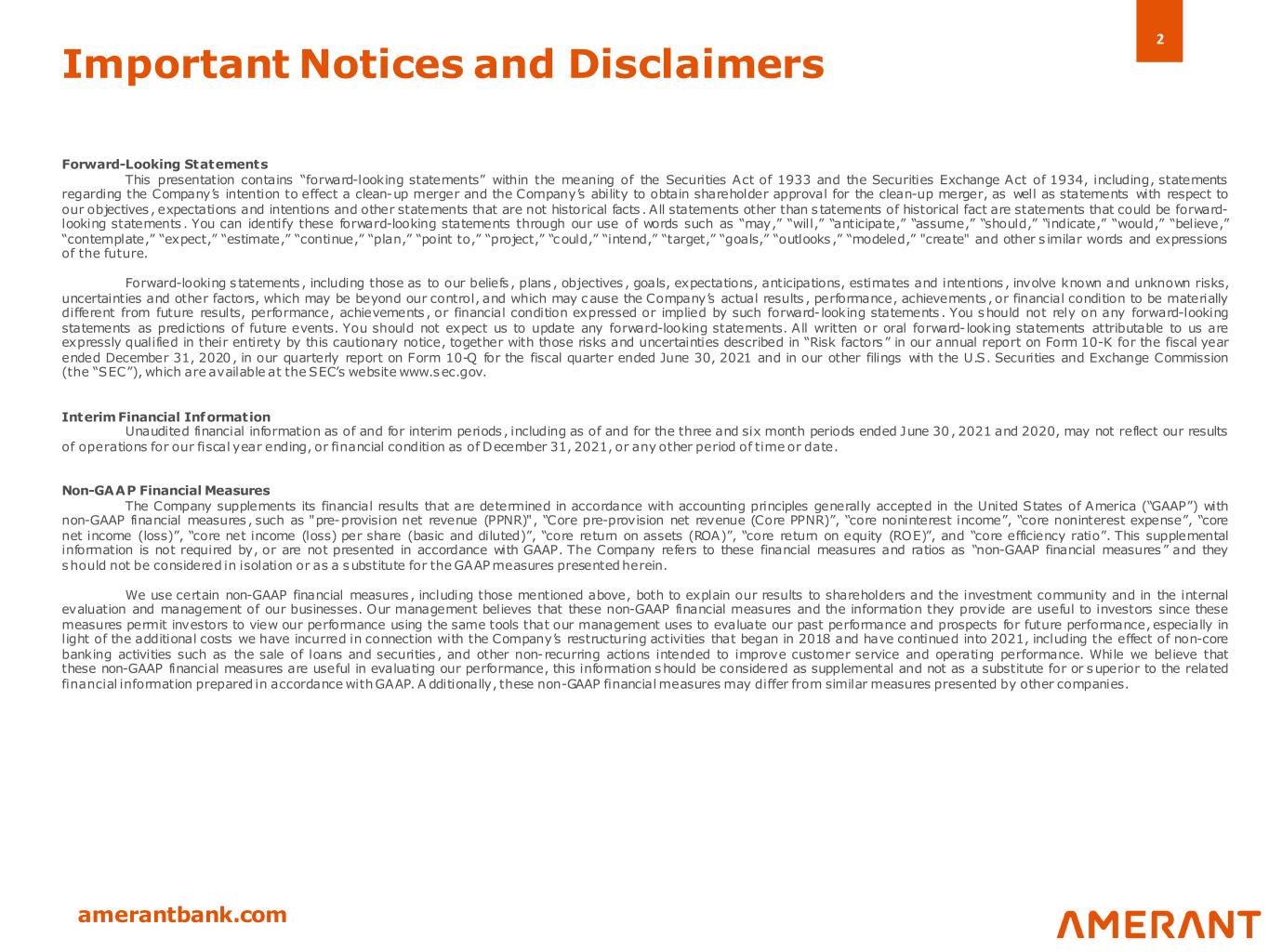 2 amerantbank.com Forward-Looking Statements This presentation contains “forward-looking statements” within the meaning of the Securities Act of 1933 and the Securities Exchange Act of 1934, including, statements regarding the Company’s intention to effect a clean-up merger and the Company’s ability to obtain shareholder approval for the clean-up merger, as well as statements with respect to our objectives , expectations and intentions and other statements that are not historical facts . All statements other than statements of historical fact are statements that could be forward- looking statements . You can identify these forward-looking statements through our use of words such as “may,” “will,” “anticipate,” “assume,” “should,” “indicate,” “would,” “believe,” “contemplate,” “expect,” “estimate,” “continue,” “plan,” “point to,” “project,” “could,” “intend,” “target,” “goals,” “outlooks ,” “modeled,” "create" and other s imilar words and expressions of the future. Forward-looking s tatements , including those as to our beliefs , plans , objectives , goals, expectations, anticipations, estimates and intentions , involve known and unknown risks, uncertainties and other factors, which may be beyond our control, and which may cause the Company’s actual results , performance, achievements , or financial condition to be materially different from future results, performance, achievements , or financial condition expressed or implied by such forward-looking statements . You should not rely on any forward-looking statements as predictions of future events. You should not expect us to update any forward-looking statements. All written or oral forward-looking statements attributable to us are expressly qualified in their entirety by this cautionary notice, together with those risks and uncertainties described in “Risk factors” in our annual report on Form 10-K for the fiscal year ended December 31, 2020, in our quarterly report on Form 10-Q for the fiscal quarter ended June 30, 2021 and in our other filings with the U.S. Securities and Exchange Commission (the “SEC”), which are available at the SEC’s website www.sec.gov. Interim Financial Information Unaudited financial information as of and for interim periods , including as of and for the three and six month periods ended June 30, 2021 and 2020, may not reflect our results of operations for our fiscal year ending, or financial condition as of December 31, 2021, or any other period of time or date. Non-GAAP Financial Measures The Company supplements its financial results that are determined in accordance with accounting principles generally accepted in the United States of America (“GAAP”) with non-GAAP financial measures , such as "pre-provision net revenue (PPNR)", “Core pre-provision net revenue (Core PPNR)”, “core noninterest income”, “core noninterest expense”, “core net income (loss)”, “core net income (loss) per share (basic and diluted)”, “core return on assets (ROA)”, “core return on equity (ROE)”, and “core efficiency ratio”. This supplemental information is not required by, or are not presented in accordance with GAAP. The Company refers to these financial measures and ratios as “non-GAAP financial measures” and they should not be considered in isolation or as a substitute for the GAAPmeasures presentedherein. We use certain non-GAAP financial measures , including those mentioned above, both to explain our results to shareholders and the investment community and in the internal evaluation and management of our businesses. Our management believes that these non-GAAP financial measures and the information they provide are useful to investors since these measures permit investors to view our performance using the same tools that our management uses to evaluate our past performance and prospects for future performance, especially in light of the additional costs we have incurred in connection with the Company’s restructuring activities that began in 2018 and have continued into 2021, including the effect of non-core banking activities such as the sale of loans and securities , and other non-recurring actions intended to improve customer service and operating performance. While we believe that these non-GAAP financial measures are useful in evaluating our performance, this information should be considered as supplemental and not as a substitute for or superior to the related financial information prepared in accordance withGAAP. A dditionally, these non-GAAP financial measures may differ from similar measures presented by other companies. Important Notices and Disclaimers