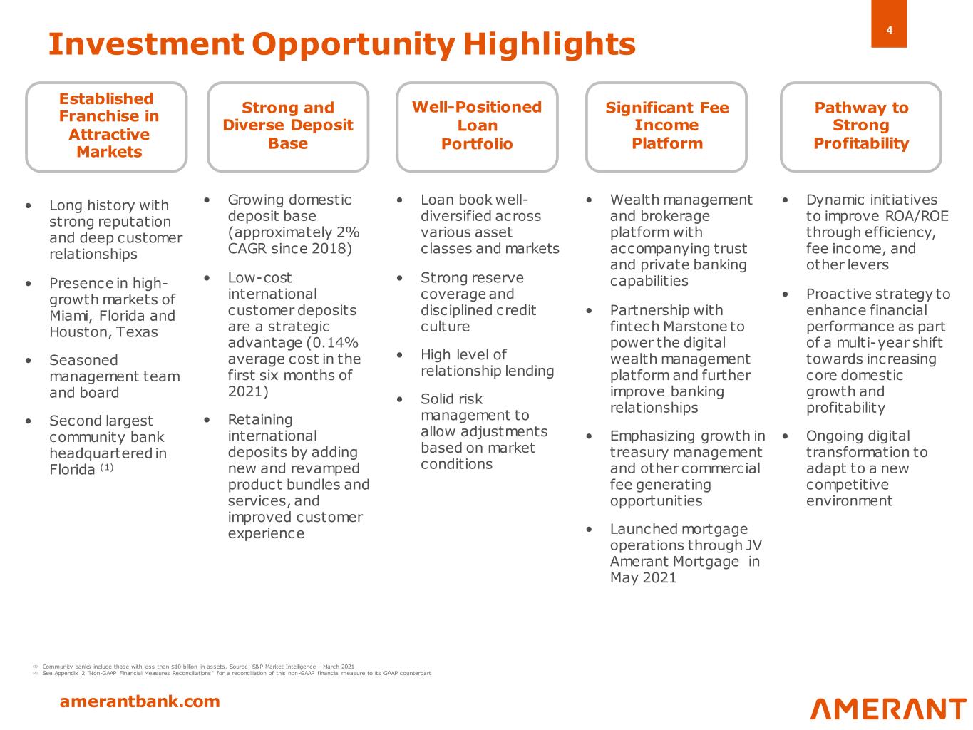 3 amerantbank.com Domestic • Second largest community bank headquartered in Florida About Us • 25 branches throughout South Florida and Houston • $5.67 billion • $7.53 billion • Coral Gables, FL • 719 FTEs (6) • $2.1 billion under management/custody • Founded in 1979 • Completed IPO in Dec. 2018 • Rebranded as Amerant in June 2019 Footprint Assets Headquarters Employees Loans Deposits Geographic Mix Financial Highlights AUM (1) See Appendix 2 ”Non-GAAP Financial Measures Reconciliations" for a reconciliation of these non-GAAP financial measures to their GAAP counterparts. (2) Includes 49% minority interest ofAmerant MortgageLLC. (3) Efficiency ratio is the result of noninterest expense, respectively divided by the sum of noninterest income and net interest income (4) Non-performing assets include all accruing loans past due 90 days or more, all nonaccrual loans, restructured loans that are considered “troubled debtrestructurings” or “TDRs”, and OREO properties acquired through or in lieu of foreclosure (5) Calculated based upon the average daily balance of outstanding loan principal balance net of unamortized deferred loan origination fees and costs,excludingthe allowance for loanlosses (6) Since 2018, the Companyhas reduced FTEs by 21.1%. Market Share History Deposits June 30, 2021 (in millions, except per share data and percentages) 2Q21 YTD 2020 2019 2018 Balance Sheet A ssets $ 7,533 $ 7,771 $ 7,985 $ 8,124 Loans 5,609 5,842 5,744 5,920 Deposits 5 ,675 5,732 5,757 6,033 Tangible Common Equity (1) 777 762 813 726 Income Statement Net Income (Loss) attributable to the C ompany (2) $ 30.4 $ (1.7 ) $ 51.3 $ 45.8 C ore Net Income (Loss) (1) $ 29.8 $ (7.0 ) $ 51.8 $ 58.0 C ore P re-provision net revenue (1) $ 32.7 $ 71.0 $ 61.4 $ 71.1 Net Income (Loss) per Share - Basic $ 0.81 $ (0.04) $ 1.21 $ 1.08 C ore Net Income (Loss) per Share - Bas ic (1) $ 0.79 $ (0.17) $ 1.22 $ 1.36 ROA 0.80 % (0.02)% 0.65 % 0.55 % C ore ROA (1) 0.78 % (0.09)% 0.65 % 0.69 % ROE 7.80 % (0.21)% 6.43 % 6.29 % C ore ROE (1) 7.64 % (0.83)% 6.49 % 7.97 % Effic iency Ratio (3) 74.4 % 68.0 % 77.5 % 78.8 % C ore E fficiency Ratio (1)(3) 73.9 % 70.1 % 76.9 % 74.0 % Capital C ommon equity tier 1 capital ratio 12.0 % 12.6 % 12.6 % 11.1 % Tangible Common Equity Ratio 10.4 % 10.2 % 10.2 % 9.0 % Stockholders' book value per common share $ 21.27 $ 19.35 $ 19.35 $ 17.31 Tangible Book Value per Common Share (1) $ 20.67 $ 18.84 $ 18.84 $ 16.82 Asset Quality Non-performing Assets (4) / A ssets 1.61 % 1.13 % 0.41 % 0.22 % Net charge offs / A verage Total Loans (5) 0.06 % 0.52 % 0.11 % 0.18 % International