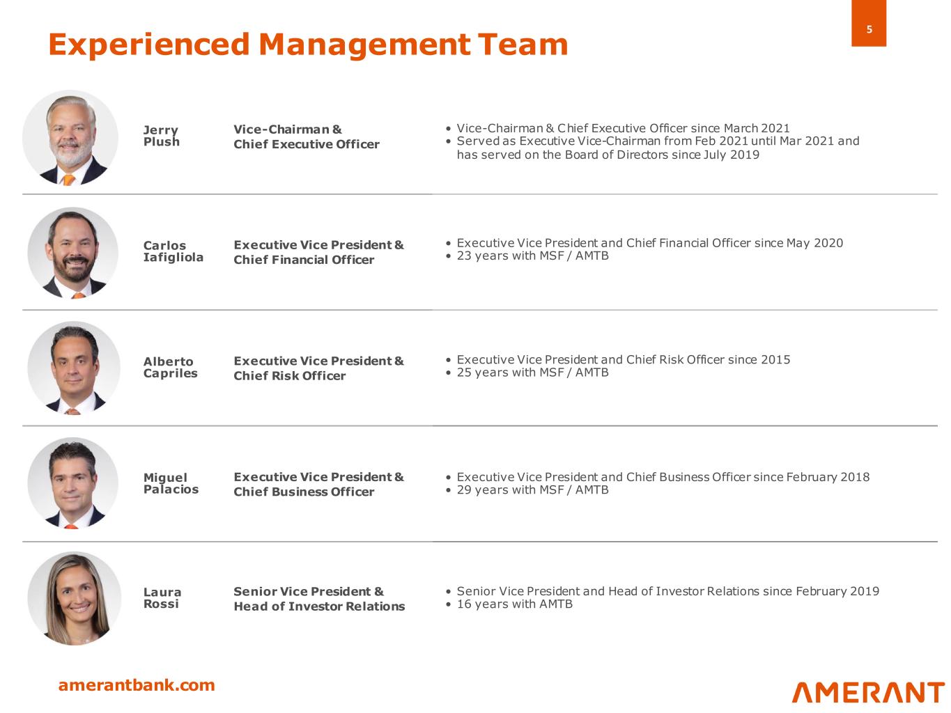 4 amerantbank.com Established Franchise in Attractive Markets Pathway to Strong Profitability Significant Fee Income Platform Well-Positioned Loan Portfolio Strong and Diverse Deposit Base Investment Opportunity Highlights • Long history with strong reputation and deep customer relationships • Presence in high- growth markets of Miami, Florida and Houston, Texas • Seasoned management team and board • Second largest community bank headquartered in Florida (1) • Growing domestic deposit base (approximately 2% CAGR since 2018) • Low-cost international customer deposits are a strategic advantage (0.14% average cost in the first six months of 2021) • Retaining international deposits by adding new and revamped product bundles and services, and improved customer experience • Loan book well- diversified across various asset classes and markets • Strong reserve coverage and disciplined credit culture • High level of relationship lending • Solid risk management to allow adjustments based on market conditions • Wealth management and brokerage platform with accompanying trust and private banking capabilities • Partnership with fintech Marstone to power the digital wealth management platform and further improve banking relationships • Emphasizing growth in treasury management and other commercial fee generating opportunities • Launched mortgage operations through JV Amerant Mortgage in May 2021 • Dynamic initiatives to improve ROA/ROE through efficiency, fee income, and other levers • Proactive strategy to enhance financial performance as part of a multi-year shift towards increasing core domestic growth and profitability • Ongoing digital transformation to adapt to a new competitive environment (1) Community banks include those with less than $10 billion in assets. Source: S&P Market Intelligence - March 2021 (2) See Appendix 2 ”Non-GAAP Financial Measures Reconciliations" for a reconciliation of this non-GAAP financial measure to its GAAP counterpart