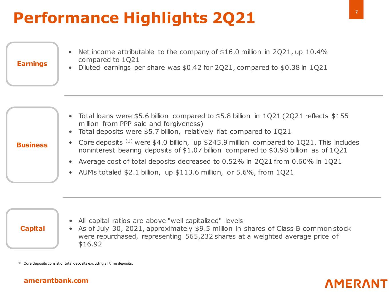 6 amerantbank.com T e x a s June 30, 2021 Growing and Attractive Markets (1) The Company announced closing of its Wellington branch expected in 3Q21 (2) Deposit Market Share data is as of June 30, 2021. For the current number of branches see Branch Footprint (3) Includes brokered deposits of $531 million as of June 30, 2021 (4) Includes the Katy, TX branch. The city of Katy is in Harris, Fort Bend, and Waller Counties and the new facility serves nearby areas of these counties (5) Our Sugar Land, TX branch also serves Fort Bend County and our Katy, TX branch lies adjacent to this market (6) Community banks include those with less than $10 billion in assets Sources: Deposit data from FDIC as of June 30, 2021 (Bank-level). Market demographics, and county data and market share from S&P Global. Market Intelligence as of June 30, 2021 Amerant is the largest community bank in the Miami-Dade MSA (6) Deposit Market Share (2) Market Demographics Market Deposits ($mm) % of AMTB Market Share % Miami-Dade, FL (3) 4,686 82.1 2.6 Broward, FL $326 5.7 0.5 Palm Beach, FL $115 1.7 0.2 Florida $ 5,127 90 % 1.9 % Market Deposits ($mm) % of AMTB Market Share % Harris, TX (4)(5) $584 0.1 0.9 Texas $ 584 10 % 0.9% Branch Footprint (1) F lo r id a 2010 – 2021 Est. Population Change 2021 – 2026 Est. Population Change 7 banking centers 18 banking centers June 30, 2021