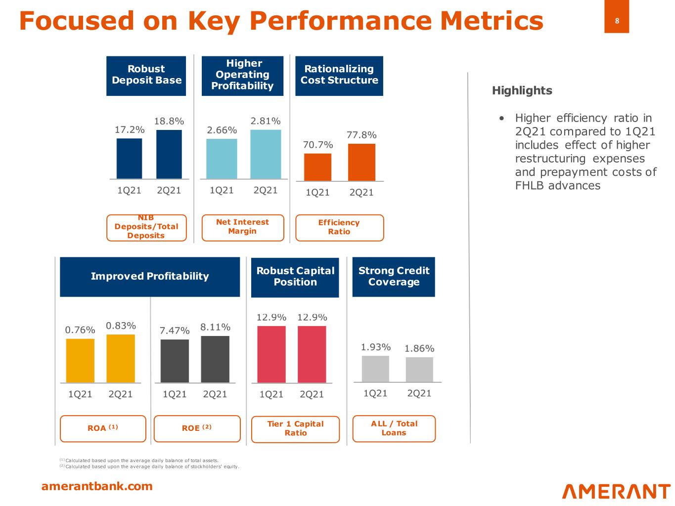 7 amerantbank.com Performance Highlights 2Q21 • All capital ratios are above "well capitalized" levels • As of July 30, 2021, approximately $9.5 million in shares of Class B common stock were repurchased, representing 565,232 shares at a weighted average price of $16.92 Capital Business • Net income attributable to the company of $16.0 million in 2Q21, up 10.4% compared to 1Q21 • Diluted earnings per share was $0.42 for 2Q21, compared to $0.38 in 1Q21 • Total loans were $5.6 billion compared to $5.8 billion in 1Q21 (2Q21 reflects $155 million from PPP sale and forgiveness) • Total deposits were $5.7 billion, relatively flat compared to 1Q21 • Core deposits (1) were $4.0 billion, up $245.9 million compared to 1Q21. This includes noninterest bearing deposits of $1.07 billion compared to $0.98 billion as of 1Q21 • Average cost of total deposits decreased to 0.52% in 2Q21 from 0.60% in 1Q21 • AUMs totaled $2.1 billion, up $113.6 million, or 5.6%, from 1Q21 Earnings (1) Core deposits consist of total deposits excluding all time deposits.