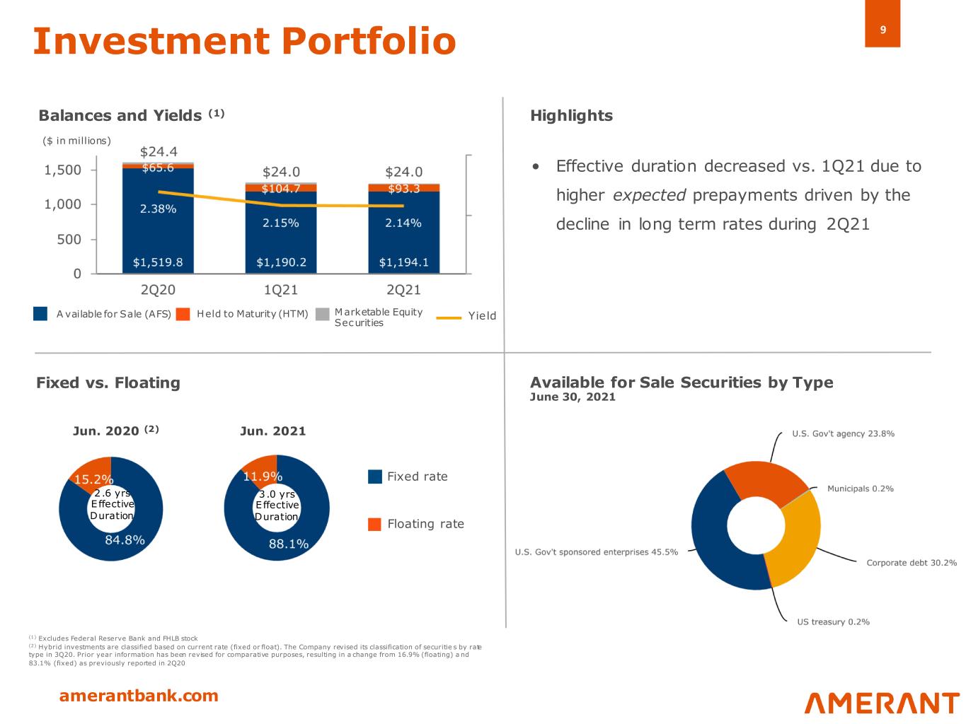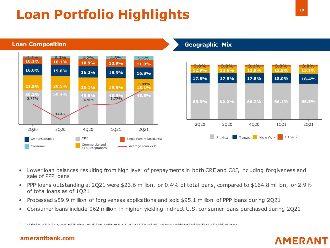 9 amerantbank.com • Effective duration decreased vs. 1Q21 due to higher expected prepayments driven by the decline in long term rates during 2Q21 Investment Portfolio Balances and Yields (1) A vailable for Sale (AFS) Held to Maturity (HTM) Highlights Fixed vs. Floating Jun. 2020 (2) Jun. 2021 Floating rate Fixed rate Available for Sale Securities by Type June 30, 2021 2.6 yrs Effective Duration ($ in millions) Marketable Equity Securities (1) Excludes Federal Reserve Bank and FHLB stock (2) Hybrid investments are classified based on current rate (fixed or float). The Company revised its classification of securitie s by rate type in 3Q20. Prior year information has been revised for comparative purposes, resulting in a change from 16.9% (floating) a nd 83.1% (fixed) as previously reported in 2Q20 Yield 3.0 yrs Effective Duration
