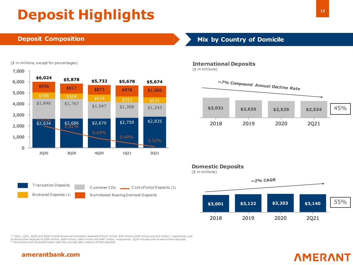 12 amerantbank.com Domestic Deposits ($ in millions) Deposit Highlights Deposit Composition 55% International Deposits ($ in millions) Mix by Country of Domicile T ransaction Deposits C ustomer CDs Brokered Deposits (1) C ost of total Deposits (2) ($ in millions, except for percentages) 45% (1) 2Q21, 1Q21, 4Q20 and 3Q20 include brokered transaction deposits of $141 million, $58 million, $140 million and $22 million, r espectively, and brokered time deposits of $390 million, $494 million, $494 million and $487 million, respectively. 2Q20 includes only brokere d time deposits. (2) Annualized and calculated based upon the average daily balance of total deposits. Noninterest Bearing Demand Deposits