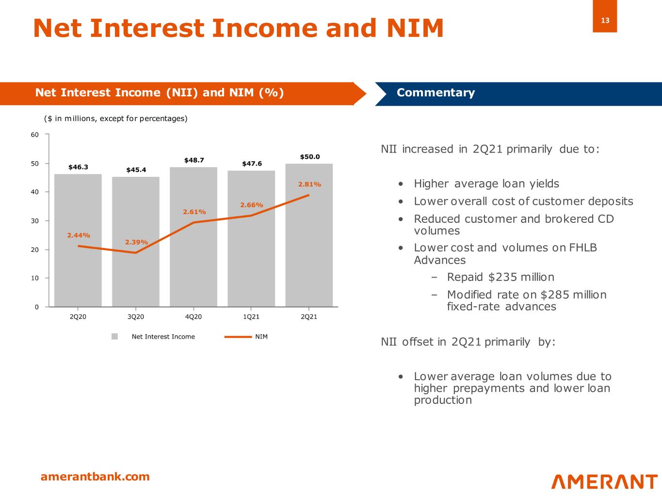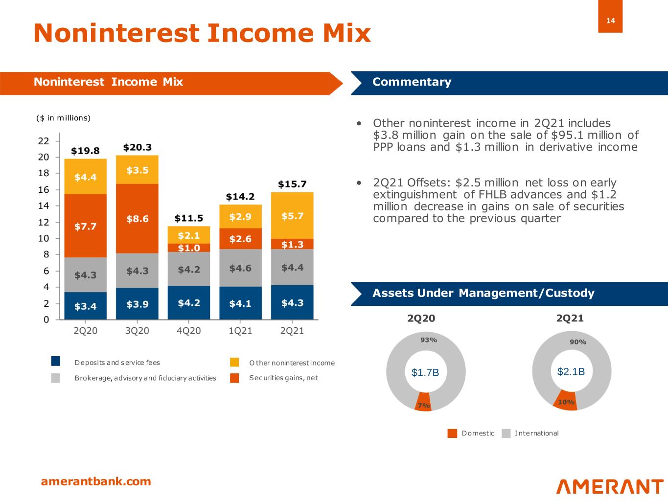 13 amerantbank.com NII increased in 2Q21 primarily due to: • Higher average loan yields • Lower overall cost of customer deposits • Reduced customer and brokered CD volumes • Lower cost and volumes on FHLB Advances – Repaid $235 million – Modified rate on $285 million fixed-rate advances NII offset in 2Q21 primarily by: • Lower average loan volumes due to higher prepayments and lower loan production Net Interest Income and NIM Net Interest Income (NII) and NIM (%) Commentary ($ in millions, except for percentages)