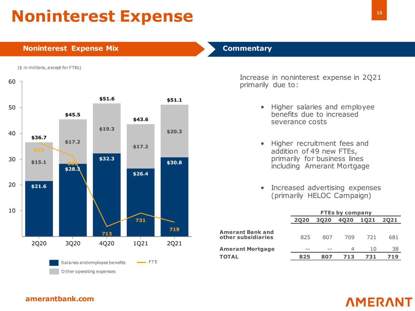 14 amerantbank.com Noninterest Income Mix Noninterest Income Mix Commentary • Other noninterest income in 2Q21 includes $3.8 million gain on the sale of $95.1 million of PPP loans and $1.3 million in derivative income • 2Q21 Offsets: $2.5 million net loss on early extinguishment of FHLB advances and $1.2 million decrease in gains on sale of securities compared to the previous quarter Assets Under Management/Custody Deposits and service fees Brokerage, advisory and fiduciary activities O ther noninterest income $2.1B Domestic International 2Q212Q20 $1.7B ($ in millions) Securities gains, net