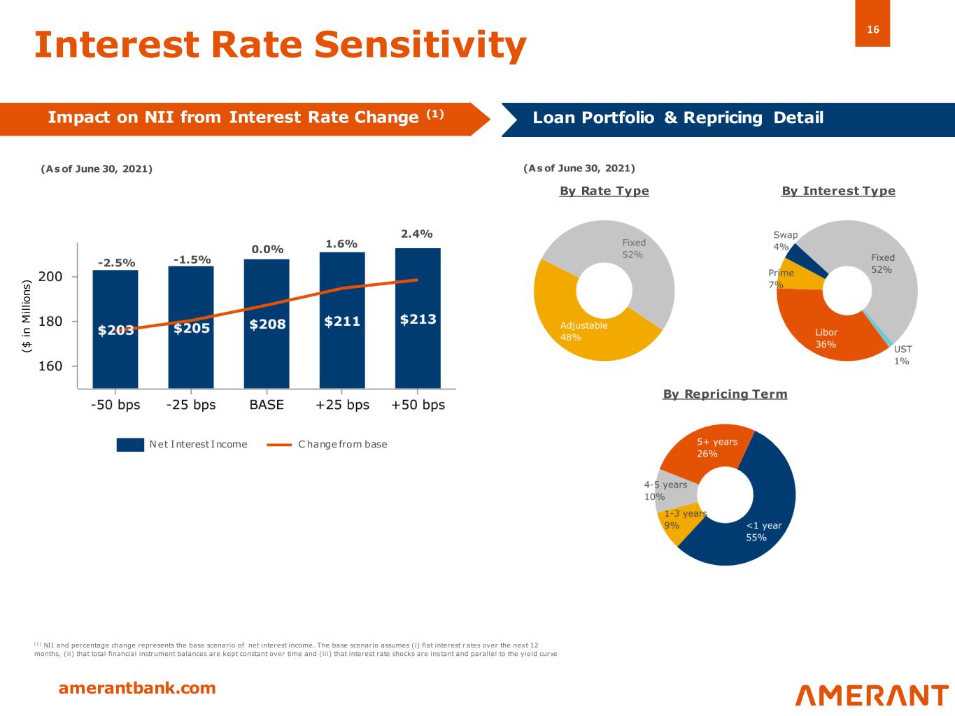 16 amerantbank.com (As of June 30, 2021) Interest Rate Sensitivity By Interest TypeBy Rate Type By Repricing Term (1) NII and percentage change represents the base scenario of net interest income. The base scenario assumes (i) flat interest r ates over the next 12 months, (ii) that total financial instrument balances are kept constant over time and (iii) that interest rate shocks are instant and parallel to the yield curve Loan Portfolio & Repricing Detail Impact on NII from Interest Rate Change (1) Net Interest Income C hange from base -2.5% -1.5% 0.0% 2.4% 1.6% ( $ i n M il li o n s ) (As of June 30, 2021)