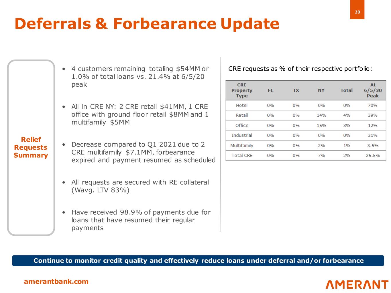 20 amerantbank.com Deferrals & Forbearance Update • 4 customers remaining totaling $54MM or 1.0% of total loans vs. 21.4% at 6/5/20 peak • All in CRE NY: 2 CRE retail $41MM, 1 CRE office with ground floor retail $8MM and 1 multifamily $5MM • Decrease compared to Q1 2021 due to 2 CRE multifamily $7.1MM, forbearance expired and payment resumed as scheduled • All requests are secured with RE collateral (Wavg. LTV 83%) • Have received 98.9% of payments due for loans that have resumed their regular payments Relief Requests Summary Continue to monitor credit quality and effectively reduce loans under deferral and/or forbearance CRE requests as % of their respective portfolio: