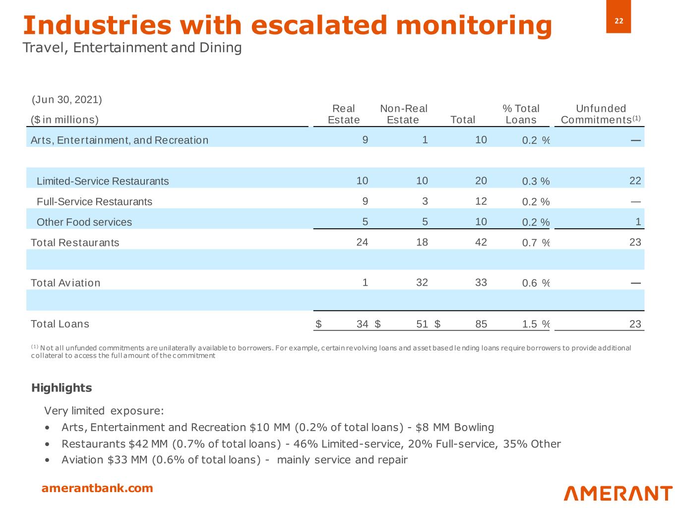 21 amerantbank.com Loan portfolio by industry • Diversified portfolio - highest sector concentration, other than real estate, at 10.2% of total loans • 77% of total loans secured by real estate • Main concentrations: CRE or Commercial Real Estate / Wholesale - Food / Retail - Gas stations / Services – Healthcare, Repair and Maintenance Highlights (1) Consists mainly of finance facilities granted to non-bank financial companies. (2) Comprised mostly of construction and real estate related services and equipment rental and leasing activities (3) Food wholesalers represented approximately 43% (4) Gasoline stations represented approximately 63% (5) Healthcare represented approximately 64% (6) Other repair and maintenance services represented 61% (7) Primarily residential, consumer loans, and cash secured loans and loans belonging to industrial sectors not included in the above sectors, which do not individually represent more than 1 percent of the total loans portfolio (8) Not all unfunded commitments are unilaterally available to borrowers. For example, certain revolving loans and asset base d lending loans require borrowers to provide additional collateral to access the full amount of the commitment ($ in millions) Real Estate Non-Real Estate Total % Total Loans Unfunded Commitments(8) Financial Sector (1) $ 5 $ 58 $ 63 1.1 % 2 4 $ 10 Construction and Real Estate & Leasing: Commercial real estate loans 2,719 — 2,719 48.6 % 190 Other real estate related services and equipment leasing (2) 56 54 110 2.0 % 23 Total construction and real estate & leasing 2,775 54 2,829 50.6 % 213 Manufacturing: Foodstuffs, Apparel 73 29 102 1.8 % 5 Metals, Computer, Transportation and Other 16 112 128 2.3 % 25 Chemicals, Oil, Plastics, Cement and Wood/Paper 24 25 49 0.9 % 5 Total Manufacturing 113 166 279 5.0 % 35 Wholesale (3) 166 402 568 10.2 % 121 Retail Trade (4) 259 99 358 6.4 % 51 Services: Communication, Transportation, Health and Other (5) 257 100 357 6.4 % 38 Accommodation, Restaurants, Entertainment and other services (6) 81 63 144 2.6 % 26 Electricity, Gas, Water, Supply and Sewage Services 6 13 19 0.4 % 6 Total Serv ices 344 176 520 9.4 % 70 Primary Products: Agriculture, Livestock, Fishing and Forestry — 1 1 — % — Mining — 6 6 0.1 % 1 Total Primary Products — 7 7 0.1 % 1 Other Loans (7) 617 342 959 17.2 % 221 Total Loans $ 4,279 $ 1,304 $ 5,583 100.0 % $ 721 (Jun 30, 2021)