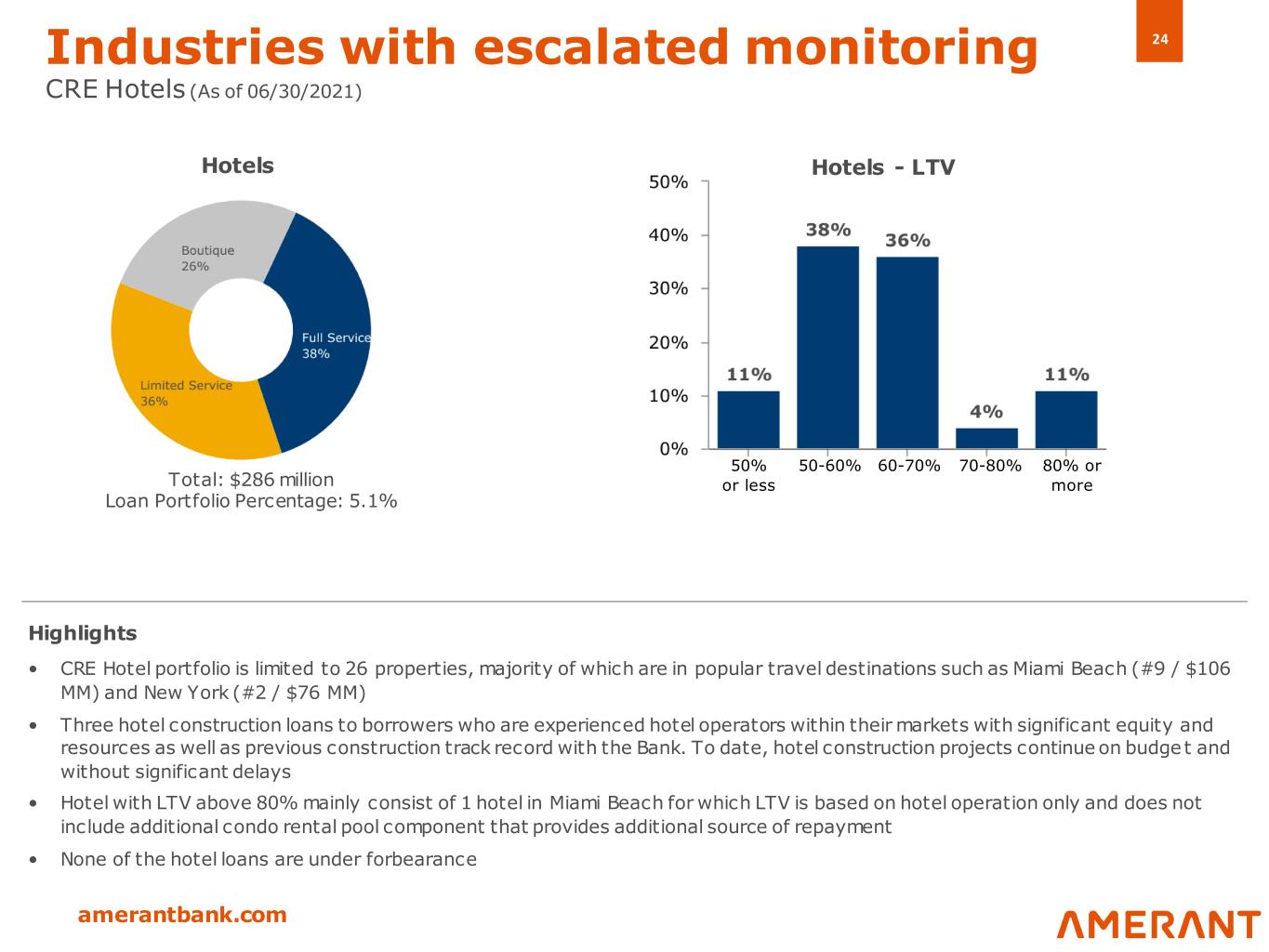 23 amerantbank.com Industries with escalated monitoring Commercial Real Estate (CRE) CRE Type FL TX NY Other Total % Total CRE % Total Loans Income Producing (1) Land and Construction Retail $ 603 $ 192 $ 282 $ — $ 1,077 39.6 % 19.3 % $ 1,069 $ 8 Multifamily 277 294 295 — 866 31.9 % 15.5 % 658 208 Office 295 16 58 — 369 13.6 % 6.6 % 369 — Hotels 210 — 76 — 286 10.5 % 5.1 % 182 103 Industrial 30 37 15 — 82 3.1 % 1.5 % 79 4 Land 37 — — — 37 1.3 % 0.7 % — 37 Total CRE $ 1,452 $ 539 $ 726 $ — $ 2,717 100.0 % 48.7 % $ 2,357 $ 360 • Conservative weighted average LTV 60% and DSC 1.4x • Strong sponsorship profile: 41% to top tier customers (multifamily 49%, retail 38%, office 38%, hotel 48%) • No significant tenant concentration in CRE retail loan portfolio, where the top 15 tenants represent 47% of the total. Major tenants include recognized national pharmacy, food and clothing retailers and banks Highlights (Jun 30, 2021) ($ in millions, except %) (1) Income producing properties include non-owner occupied and multi-family residential loans