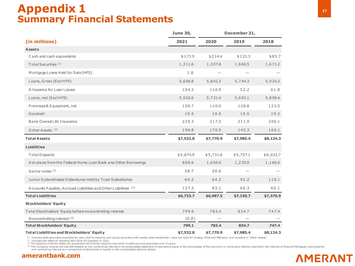 27 amerantbank.com Appendix 1 Summary Financial Statements (1) Includes debt securities available for sale, held to maturity and equity securities with readily determinable fair value not held for trading. FHLB and FRB stock are included in "Other Assets" (2) Includes the effect of adopting ASU 2016-02 (Leases) in 1Q21. (3) The balance of Senior Notes are presented net of direct issuance cost which is deferred and amortized over 5 years (4) The Company records net loss attributable to non-controlling interest in its consolidated statement of operations equal to the percentage of the economic or ownership interest retained in the interest of Amerant Mortgage, and presents non-controlling interest as a component of stockholders' equity on the consolidated balance sheets. June 30, December 31, (in millions) 2021 2020 2019 2018 Assets C ash and cash equivalents $171.5 $214.4 $121.3 $85.7 Total Securities (1) 1,311.6 1,307.6 1,666.5 1,671.2 Mortgage Loans Held for Sale (HFS) 1.8 — — — Loans, Gross (Excl HFS) 5,606.8 5,842.3 5,744.3 5,920.2 A llowance for Loan Losses 104.2 110.9 52.2 61.8 Loans, net (Excl HFS) 5,502.6 5,731.4 5,692.1 5,858.4 P remises & Equipment, net 108.7 110.0 128.8 123.5 Goodwill 19.5 19.5 19.5 19.2 Bank Owned Life Insurance 220.3 217.5 211.9 206.1 O ther Assets (2) 196.8 170.5 145.3 160.1 Total Assets $7,532.8 $7,770.9 $7,985.4 $8,124.3 Liabilities Total Deposits $5,674.9 $5,731.6 $5,757.1 $6,032.7 A dvances from the Federal Home Loan Bank and Other Borrowings 808.6 1,050.0 1,235.0 1,166.0 Senior notes (3) 58.7 58.6 — — Junior Subordinated Debentures Held by Trust Subsidiaries 64.2 64.2 92.2 118.1 A ccounts P ayable, Accrued Liabilities and Other Liabilities (2) 127.3 83.1 66.3 60.1 Total Liabilities $6,733.7 $6,987.5 $7,150.7 $7,376.9 Stockholders' Equity Total Stockholders' Equity before noncontrolling interest 799.9 783.4 834.7 747.4 Noncontrolling interest (4) (0 .8) — — — Total Stockholders' Equity 799.1 783.4 834.7 747.4 Total Liabilities and Stockholders' Equity $7,532.8 $7,770.9 $7,985.4 $8,124.3