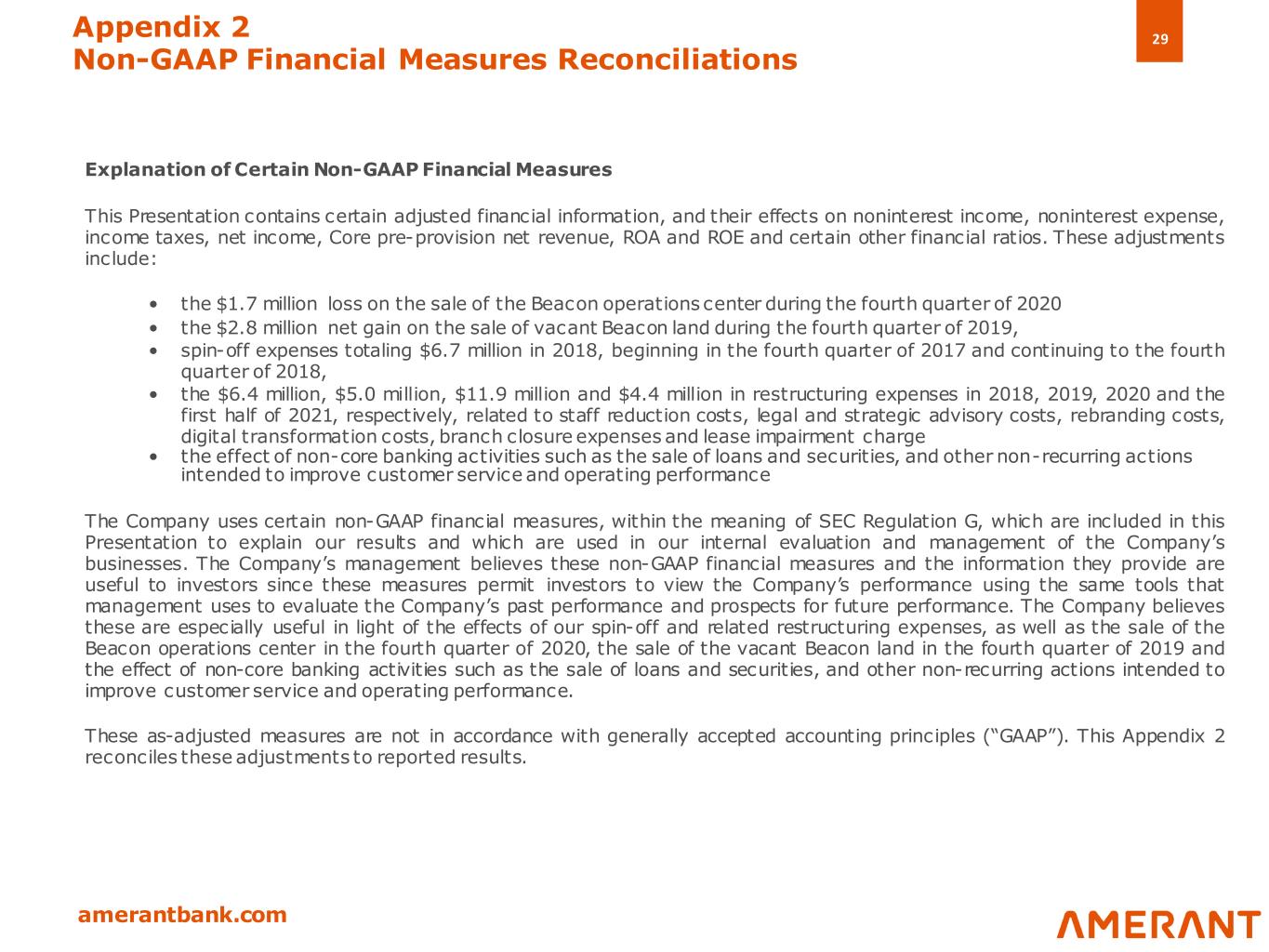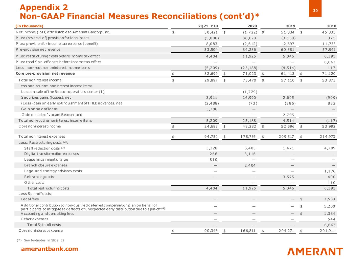 29 amerantbank.com Explanation of Certain Non-GAAP Financial Measures This Presentation contains certain adjusted financial information, and their effects on noninterest income, noninterest expense, income taxes, net income, Core pre-provision net revenue, ROA and ROE and certain other financial ratios. These adjustments include: • the $1.7 million loss on the sale of the Beacon operations center during the fourth quarter of 2020 • the $2.8 million net gain on the sale of vacant Beacon land during the fourth quarter of 2019, • spin-off expenses totaling $6.7 million in 2018, beginning in the fourth quarter of 2017 and continuing to the fourth quarter of 2018, • the $6.4 million, $5.0 million, $11.9 million and $4.4 million in restructuring expenses in 2018, 2019, 2020 and the first half of 2021, respectively, related to staff reduction costs, legal and strategic advisory costs, rebranding costs, digital transformation costs, branch closure expenses and lease impairment charge • the effect of non-core banking activities such as the sale of loans and securities, and other non-recurring actions intended to improve customer service and operating performance The Company uses certain non-GAAP financial measures, within the meaning of SEC Regulation G, which are included in this Presentation to explain our results and which are used in our internal evaluation and management of the Company’s businesses. The Company’s management believes these non-GAAP financial measures and the information they provide are useful to investors since these measures permit investors to view the Company’s performance using the same tools that management uses to evaluate the Company’s past performance and prospects for future performance. The Company believes these are especially useful in light of the effects of our spin-off and related restructuring expenses, as well as the sale of the Beacon operations center in the fourth quarter of 2020, the sale of the vacant Beacon land in the fourth quarter of 2019 and the effect of non-core banking activities such as the sale of loans and securities, and other non-recurring actions intended to improve customer service and operating performance. These as-adjusted measures are not in accordance with generally accepted accounting principles (“GAAP”). This Appendix 2 reconciles these adjustments to reported results. Appendix 2 Non-GAAP Financial Measures Reconciliations