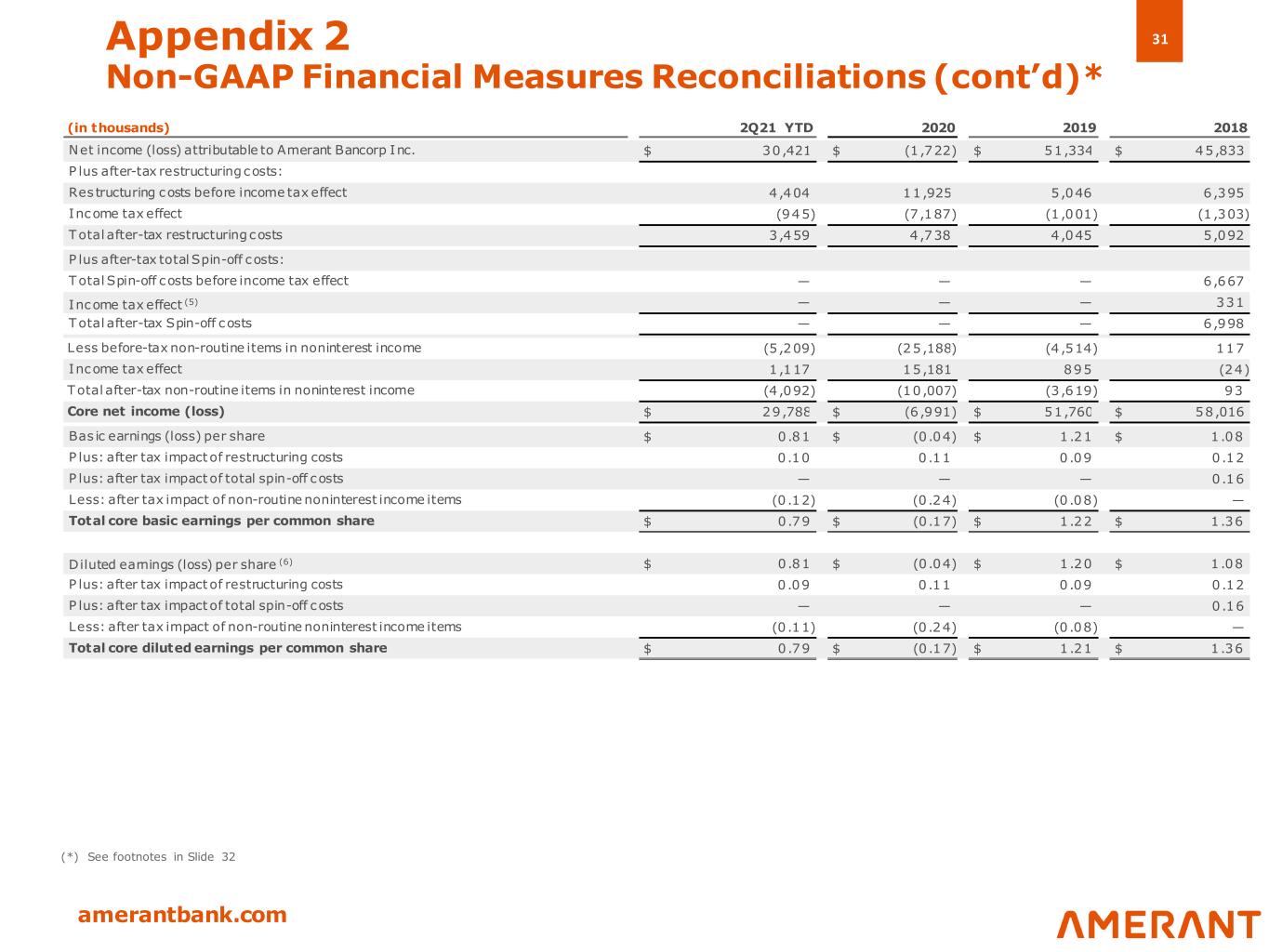 30 amerantbank.com (in thousands) 2Q21 YTD 2020 2019 2018 Net income (loss) attributable to Amerant Bancorp Inc. $ 30,421 $ (1 ,722) $ 51,334 $ 45,833 P lus: (reversal of) provision for loan losses (5 ,000) 88,620 (3,150) 375 P lus: provision for income tax expense (benefit) 8 ,083 (2,612) 12,697 11,733 P re-provision net revenue 33,504 84,286 60,881 57,941 P lus: restructuring costs before income tax effect 4 ,404 11,925 5,046 6,395 P lus: total Spin-off costs before income tax effect — — — 6,667 Less: non-routine noninterest income items (5,209) (25,188) (4 ,514) 117 Core pre-provision net revenue $ 32,699 $ 71,023 $ 61,413 $ 71,120 Total noninterest income $ 29,897 $ 73,470 $ 57,110 $ 53,875 Less non-routine noninterest income items Loss on sale of the Beacon operations center (1) — (1 ,729) — — Securities gains (losses), net 3 ,911 26,990 2,605 (999) (Loss) gain on early extinguishment of FHLB advances, net (2 ,488) (73 ) (886) 882 Gain on sale of loans 3,786 — — — Gain on sale of vacant Beacon land — — 2,795 — Total non-routine noninterest income items 5,209 25,188 4,514 (117) C ore noninterest income $ 24,688 $ 48,282 $ 52,596 $ 53,992 Total noninterest expenses $ 94,750 $ 178,736 $ 209,317 $ 214,973 Less: Restructuring costs (2): Staff reduction costs (3) 3,328 6,405 1,471 4,709 Digital transformation expenses 266 3,116 — — Lease impairment charge 810 — — — Branch closure expenses — 2,404 — — Legal and strategy advisory costs — — — 1,176 Rebranding costs — — 3,575 400 O ther costs — — — 110 Total restructuring costs 4,404 11,925 5,046 6,395 Less Spin-off costs: Legal fees — — — $ 3,539 A dditional contribution to non-qualified deferred compensation plan on behalf of participants to mitigate tax effects of unexpected early distribution due to spin-off (4) — — — $ 1,200 A ccounting and consulting fees — — — $ 1,384 O ther expenses — — — 544 Total Spin-off costs — — — 6,667 C ore noninterest expense $ 90,346 $ 166,811 $ 204,271 $ 201,911 Appendix 2 Non-GAAP Financial Measures Reconciliations (cont’d)* (*) See footnotes in Slide 32